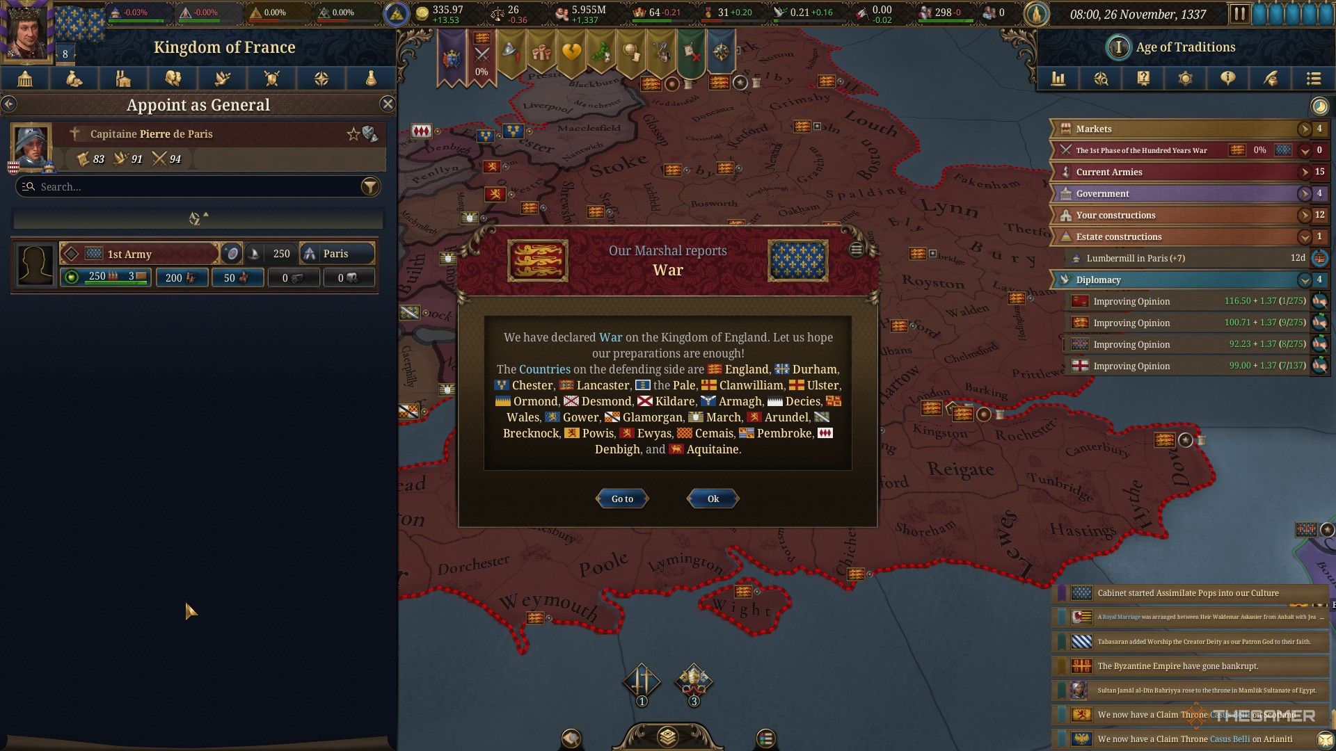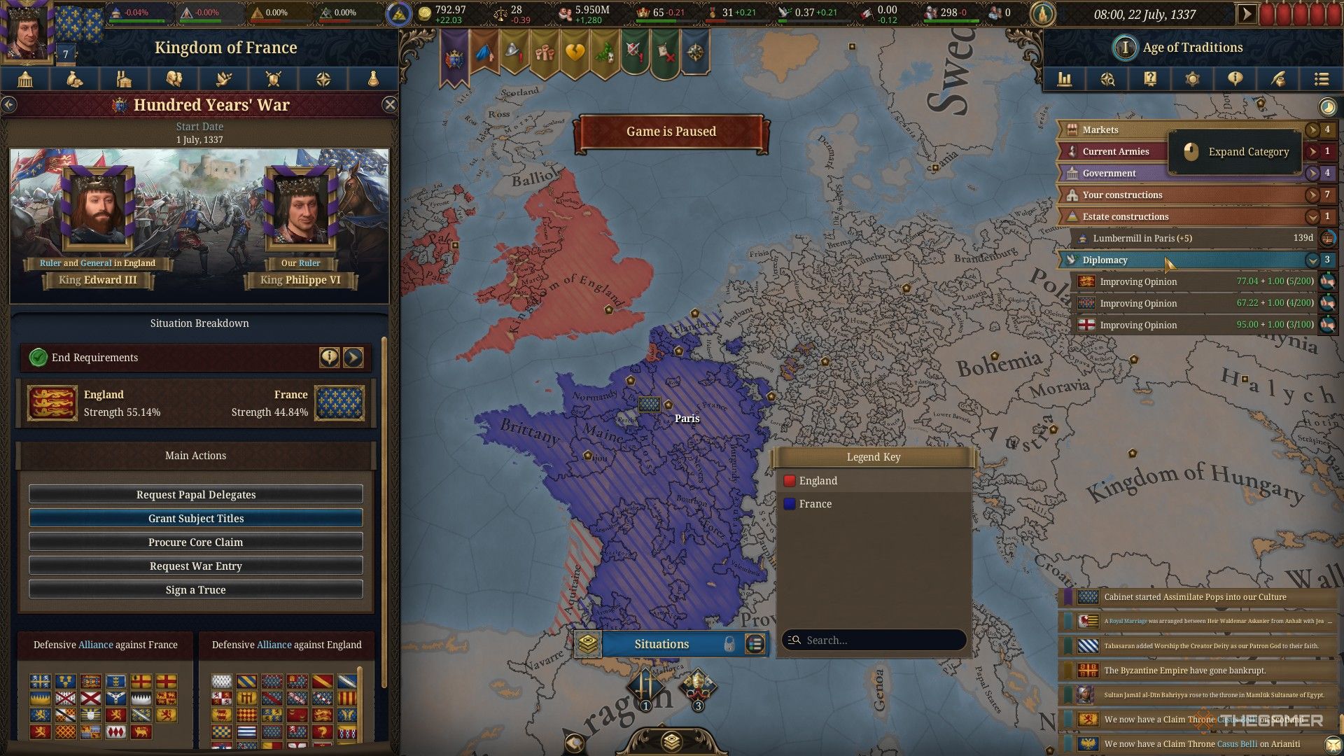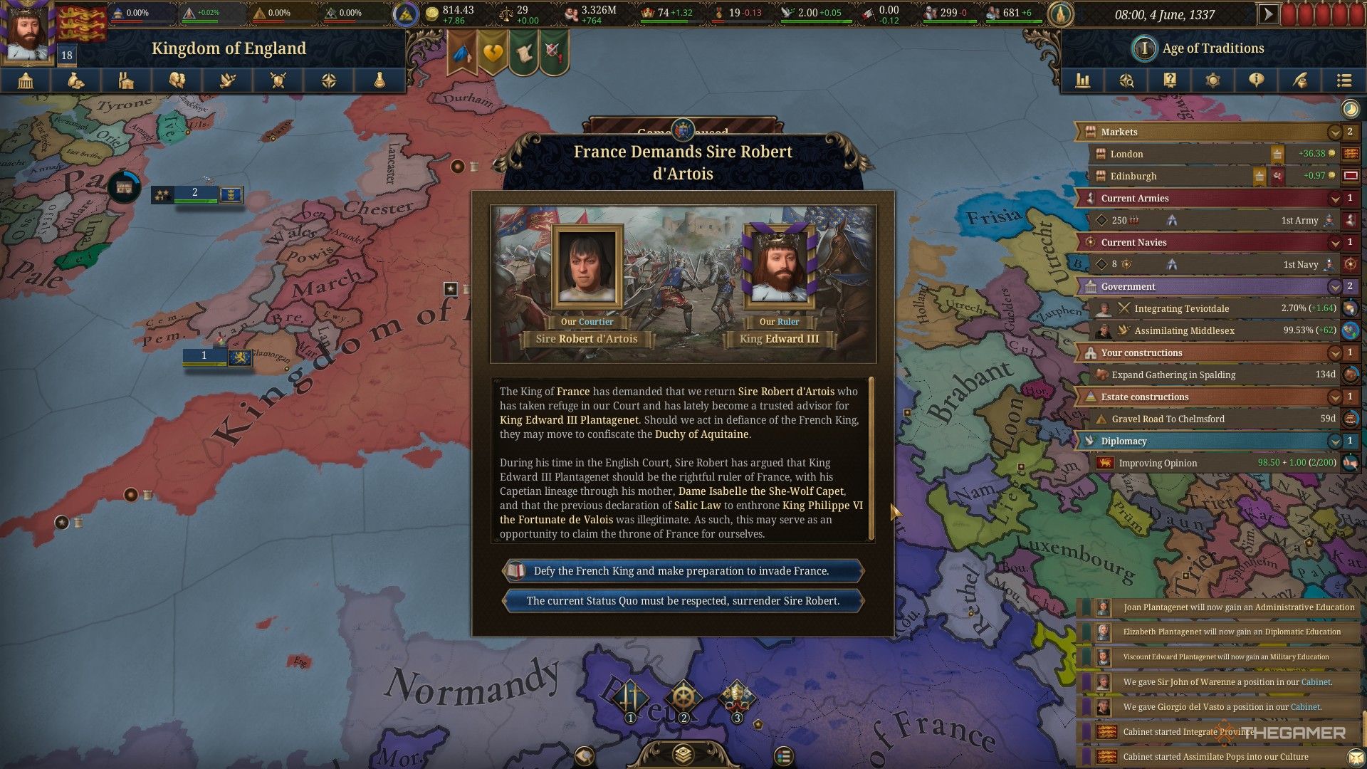 - Как Франция, ваше уведомление даёт вам выбор: потребовать капитуляцию д’Артуа и вернуться во Францию, Исторический вариант, или отказаться провоцировать Англию ради попытки сохранить мир. Нажатие может позволить вам спровоцировать Столетнюю войну до её запланированной даты начала.
