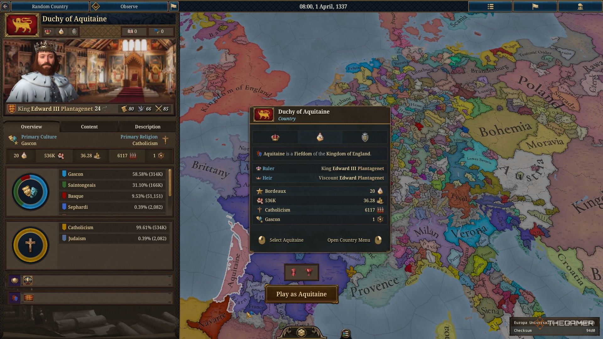 К весне 1337 года Аквитания становится все более недовольной английским правлением, и ее лояльность ослабевает. Когда французский король умирает 1 июля, это разжигает Столетнюю войну в игре, втягивая всю Европу в конфликт, который длится почти сто лет – но ваши действия как игрока могут изменить ход истории.