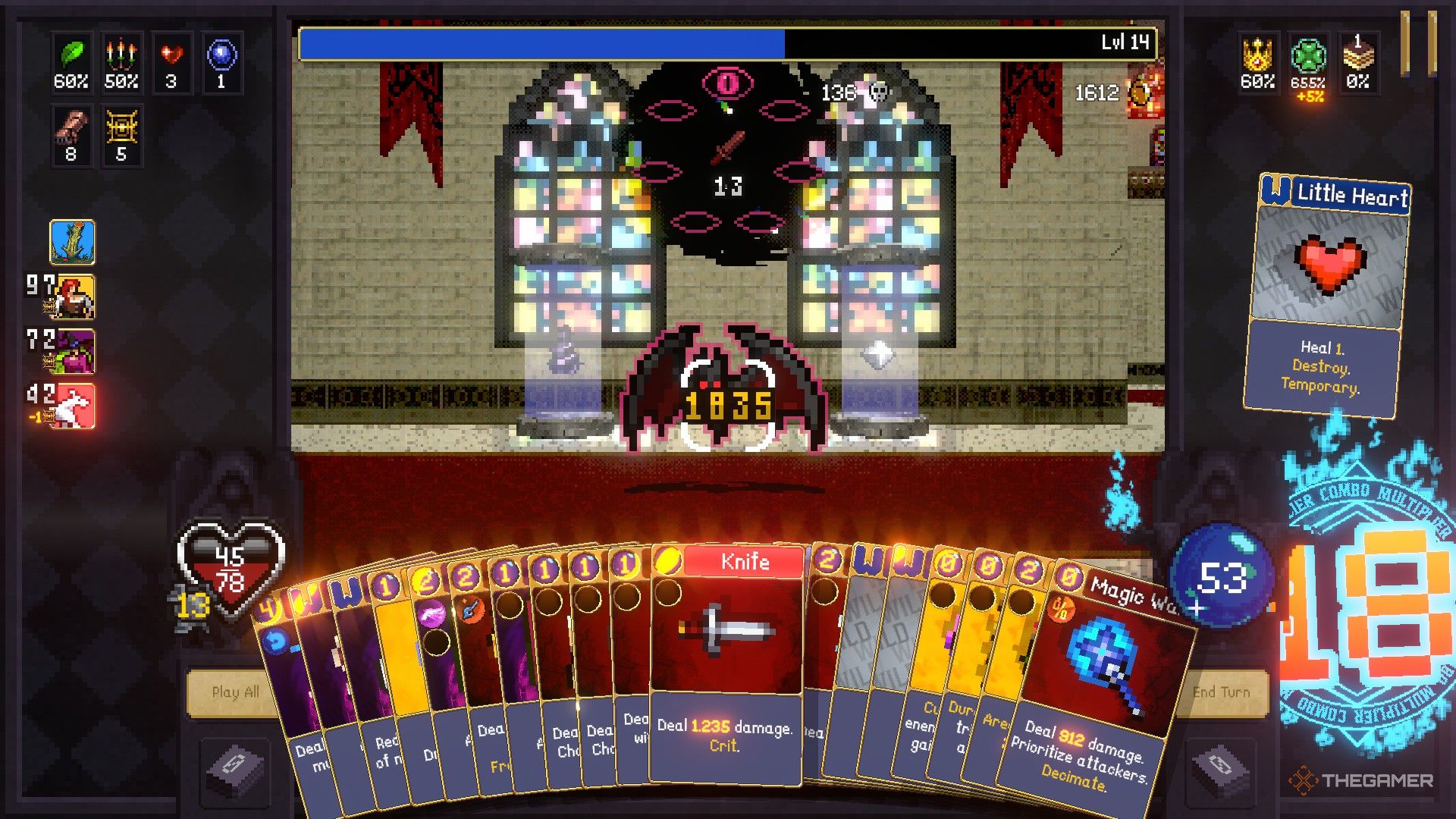 Vampire Crawlers – красивая и креативная игра, но у неё есть некоторые раздражающие недостатки. Создание длинных карточных комбинаций вознаграждается и увеличивает ваш урон, но сброшенные карты накапливаются и заслоняют важную информацию, такую как уровень Проклятия. Неясно, является ли это преднамеренным дизайнерским решением, но кажется несправедливым, когда вас наказывают за то, что вы не можете видеть жизненно важные характеристики. Недавно я оказался в сложной ситуации с опасно высоким процентом Проклятия просто потому, что карты загораживали мне его вид.
