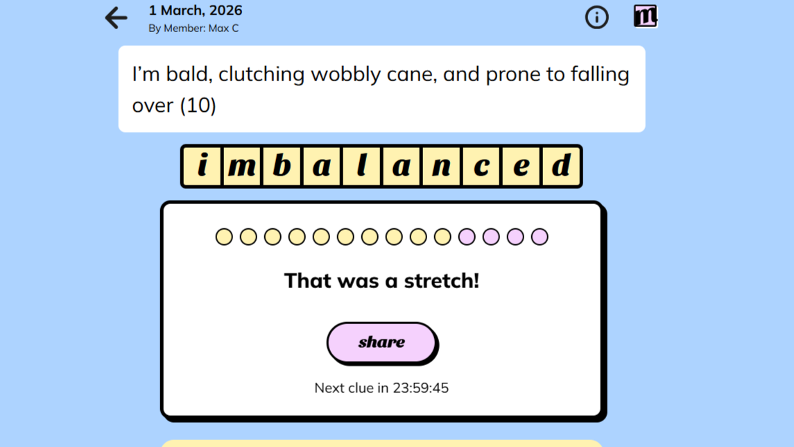 Окей, так что если я просто хочу получить ответ и сохранить свою серию на 1 марта 2026 года, я могу прокрутить вниз, чтобы найти решение. Но если я действительно хочу стать лучше в решении этих головоломок в этом месяце, мне следует посмотреть список ежедневных головоломок, чтобы потренироваться и стать еще быстрее в их решении!