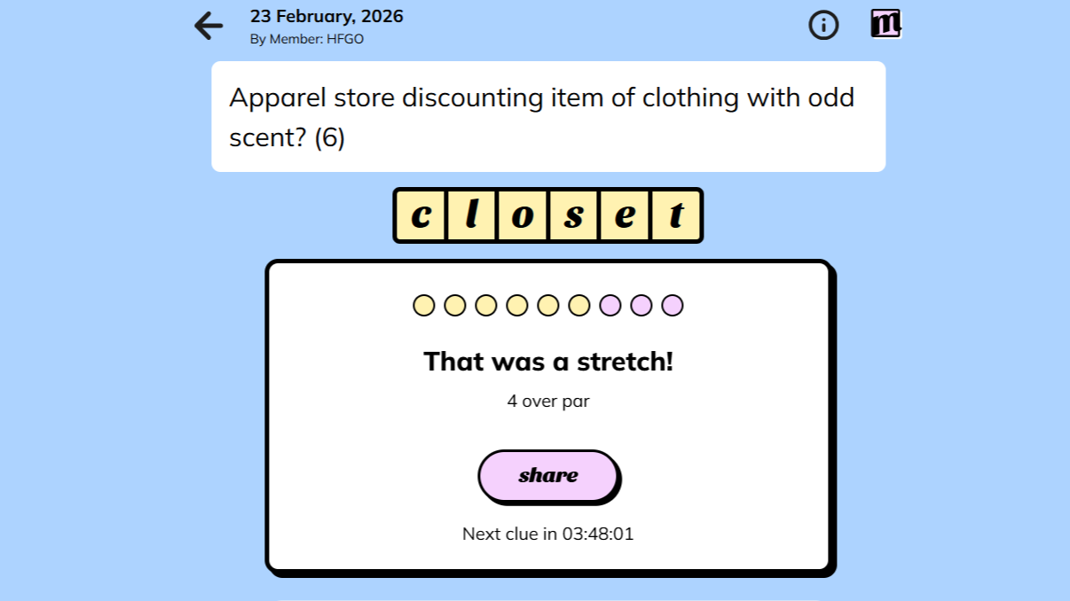 Если вы предпочитаете не разгадывать загадку самостоятельно, вы можете найти ответ к сегодняшнему головоломке Minute Cryptic (23 февраля) ниже на странице. Как только вы закончите головоломку, ознакомьтесь с нашим списком 10 лучших ежедневных головоломок, чтобы отточить свои навыки и подготовиться к более сложным загадкам на этой неделе.