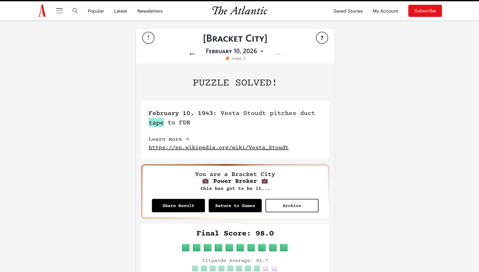 The Atlantic Bracket City Solution для 10 февраля 2026 года