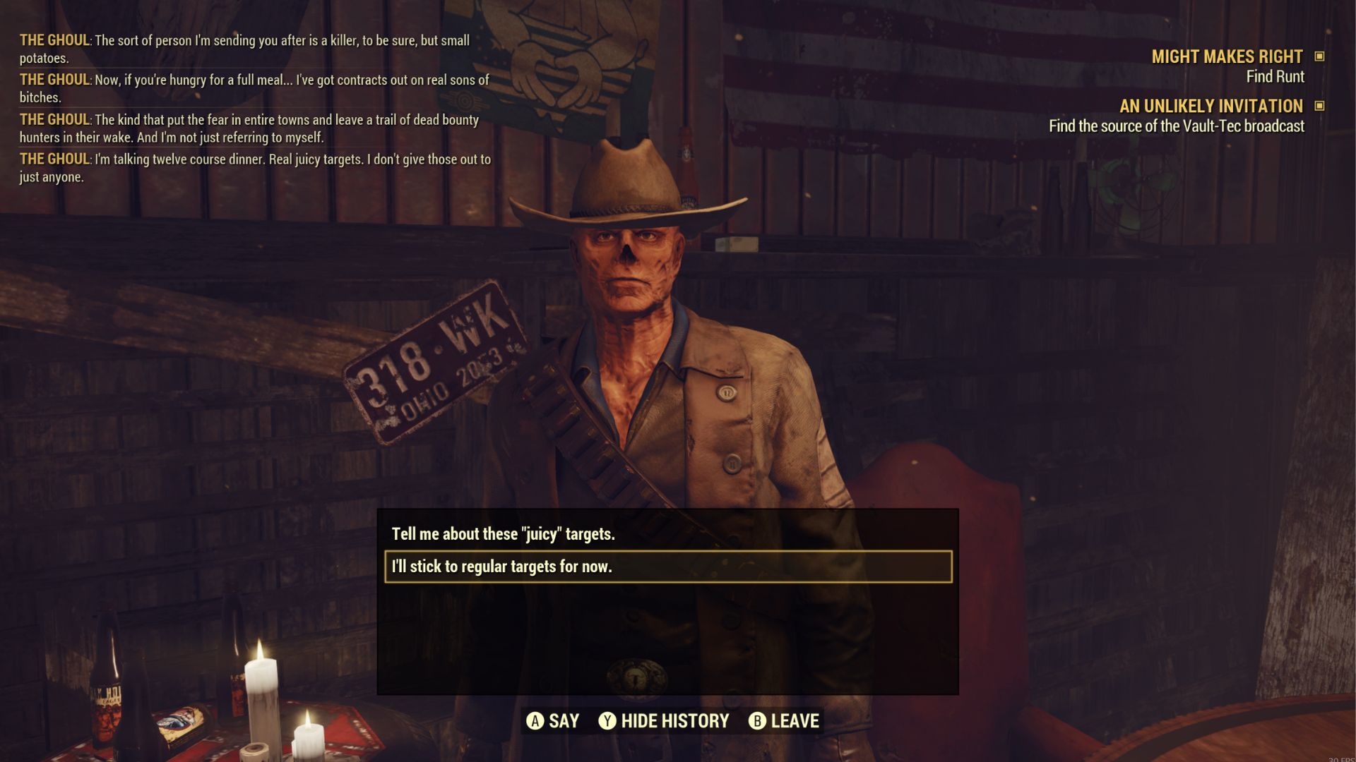 Fallout 76 теперь предлагает Охоту за головами, миссии, которые вы можете выполнять снова и снова для персонажа по имени The Ghoul. Вы также можете знать The Ghoul по телесериалу Fallout.