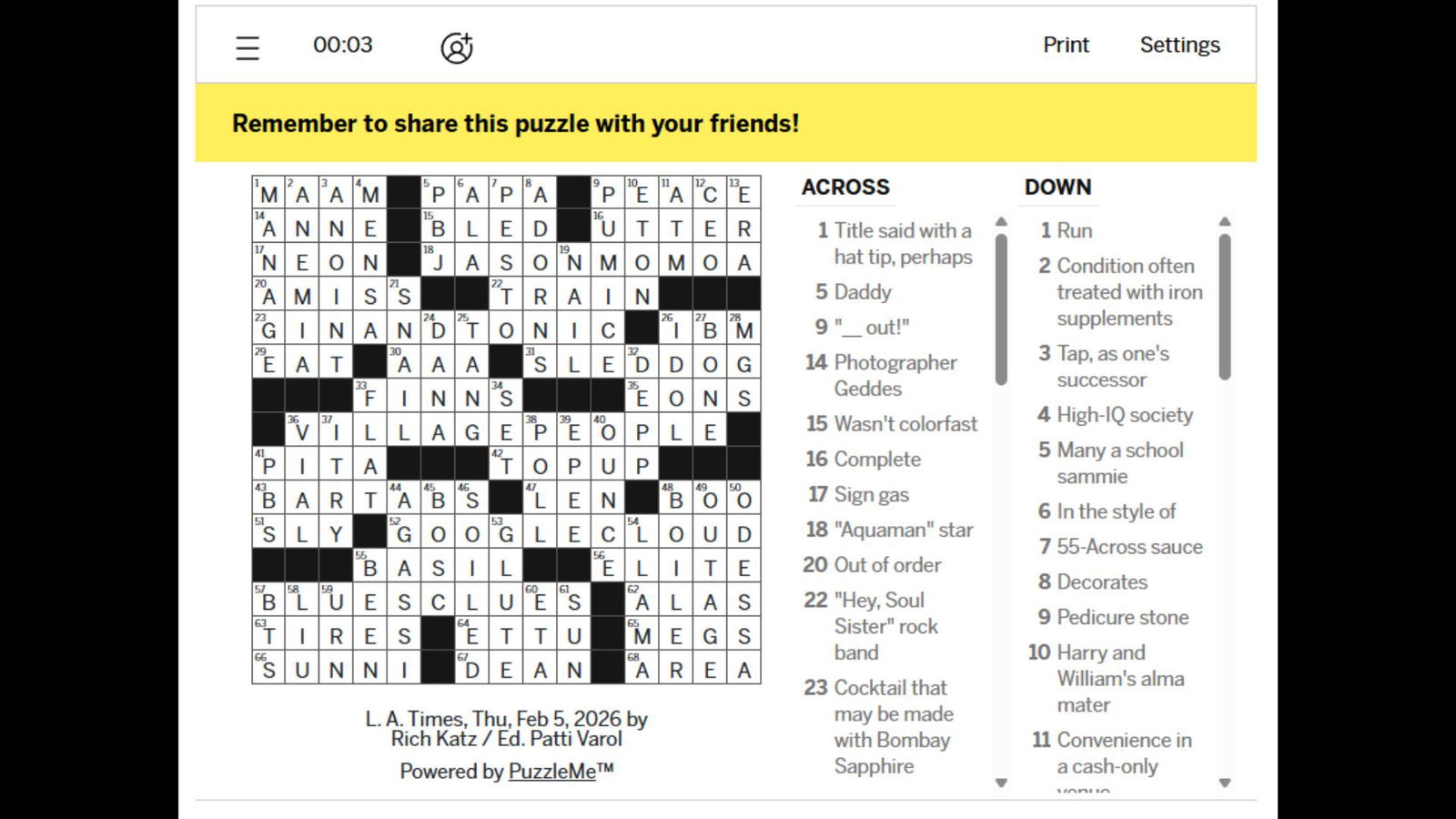 Ответы на кроссворд LA Times за 5 февраля 2026 года.