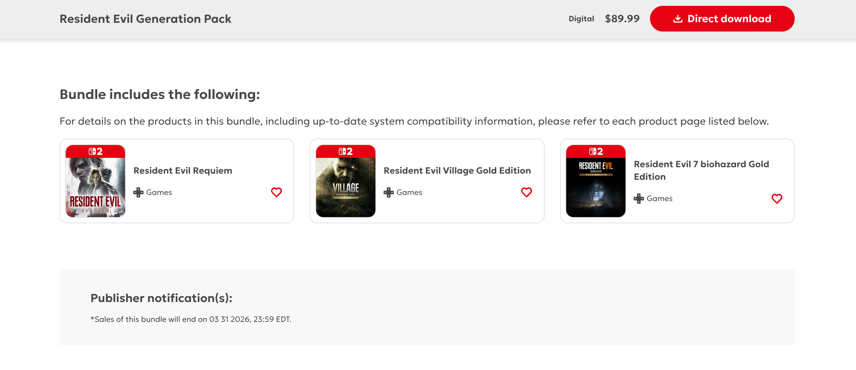 С запуском Requiem, Resident Evil 7: Biohazard и Resident Evil Village (также известная как Resident Evil 8) стали доступны на консоли благодаря специальной версии для Switch 2, включая весь загружаемый контент. Эти три недавние игры Resident Evil также объединены в пакет Resident Evil Generation Pack стоимостью 90 долларов.