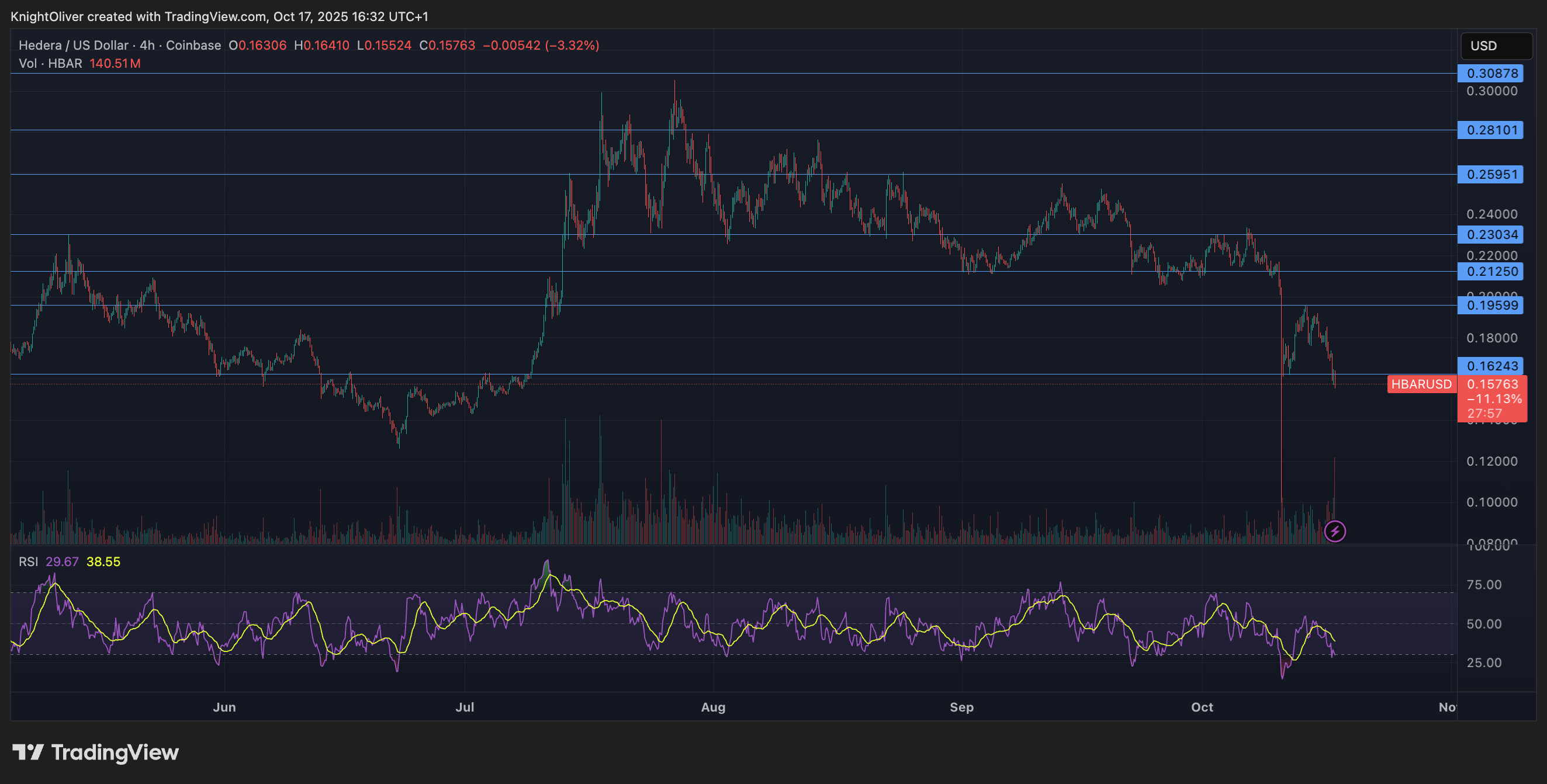 - Наш доблестный воин HBAR снизился на 11.15% за последние 24 часа, начиная с великой даты 16 октября в 15:00 и заканчивая 17 октября в 14:00.
