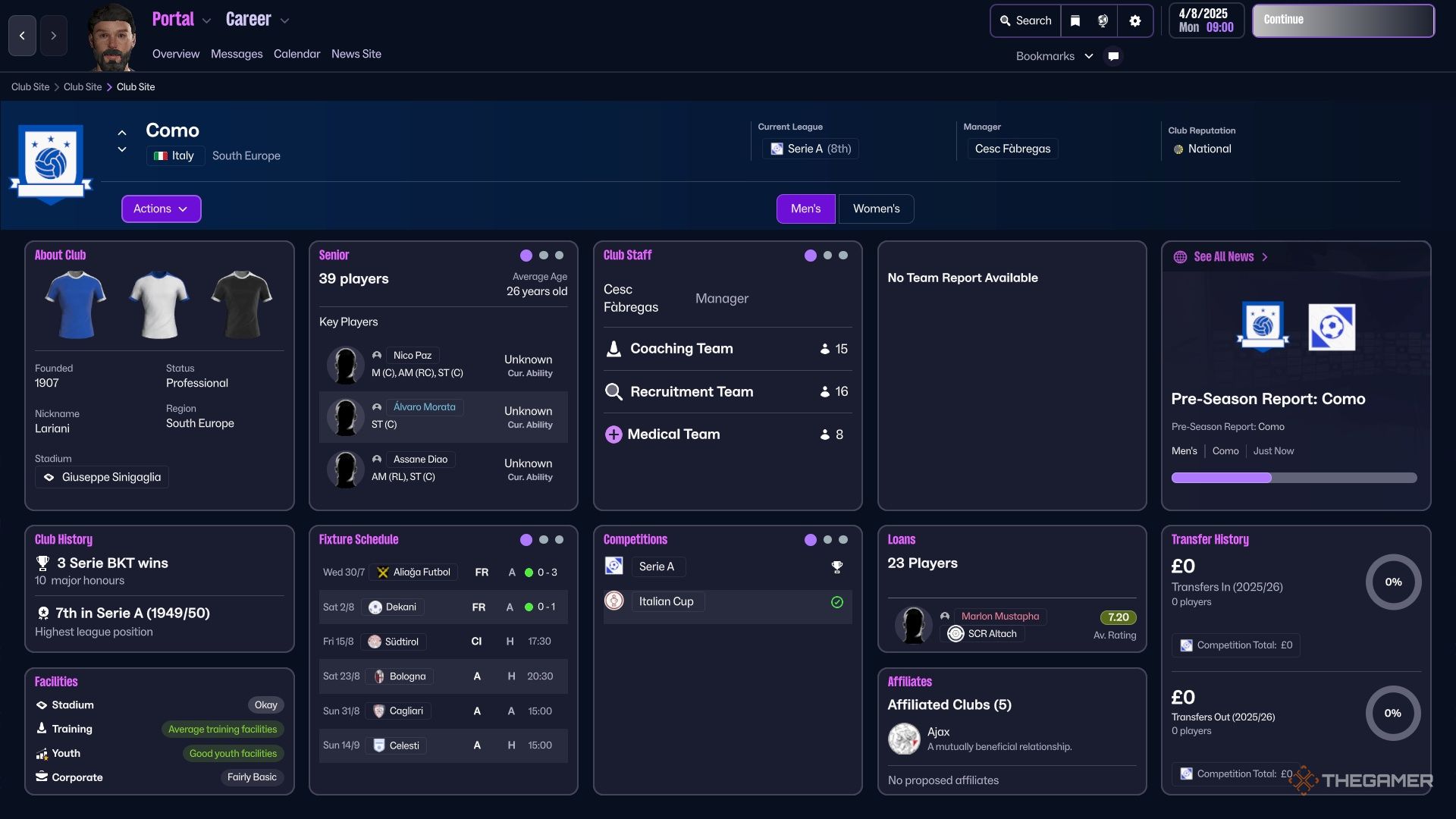 Я огромный поклонник Комо, и поразительно видеть, как далеко они продвинулись! Невероятно, что их тренирует Сеск Фабрегас – настоящий легендарный игрок! Они действительно поднялись в Серию А несколько лет назад, что произошло впервые более чем за 20 лет, и теперь они действительно начинают доказывать, что достойны играть в высшей итальянской лиге. Очень интересно наблюдать, как они строят что-то особенное.
