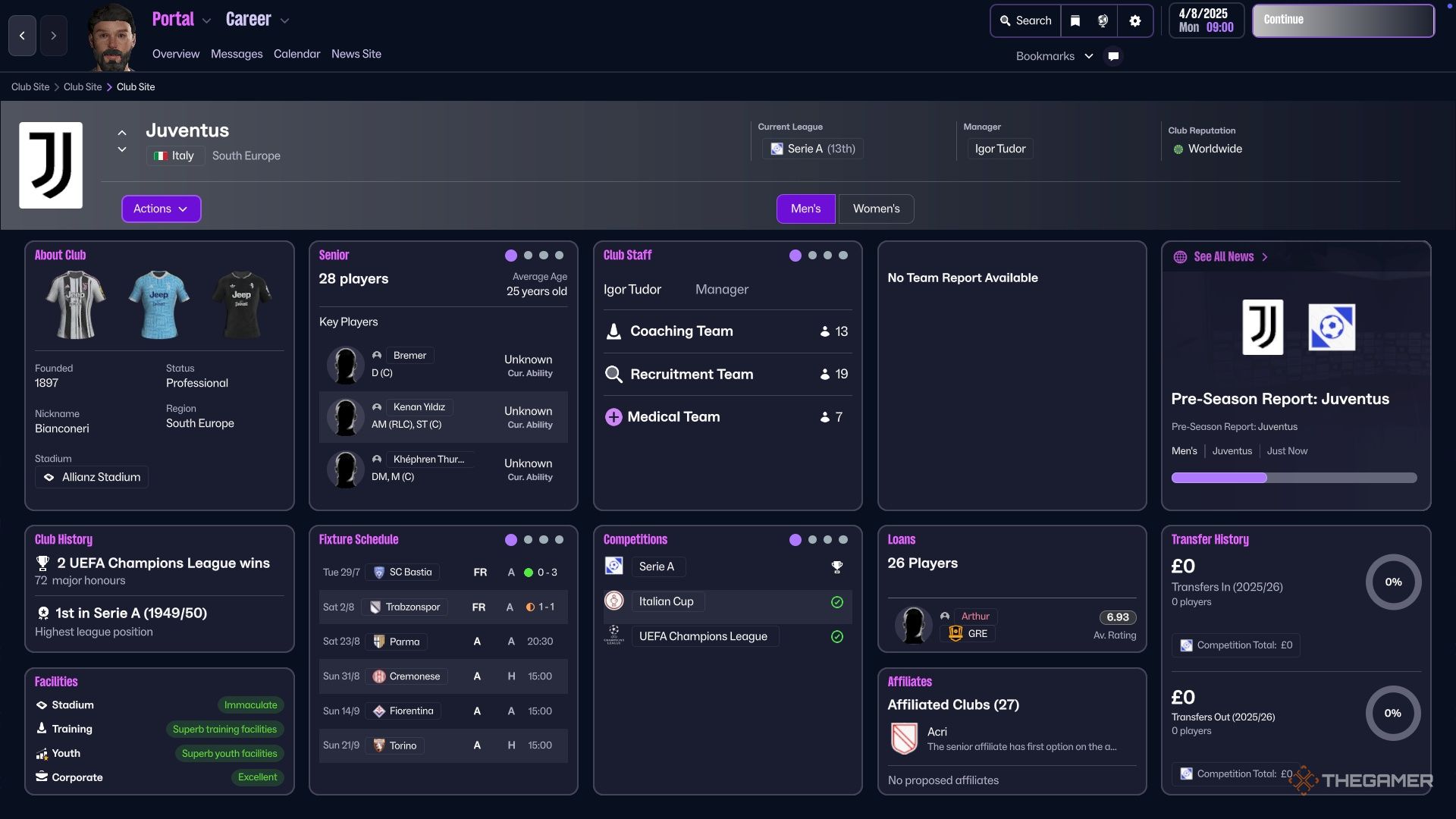 На протяжении почти десятилетия, начиная с 2010-х годов, «Juventus» доминировал в итальянском футболе, выиграв девять чемпионатов подряд. В то время как «Inter», «Milan» и «Napoli» каждый завоевали титул с тех пор, «Juventus» не смог повторить этот успех. Несмотря на это, они остаются конкурентоспособной командой с перспективными игроками, такими как Kenan Yildiz и Dusan Vlahovic.