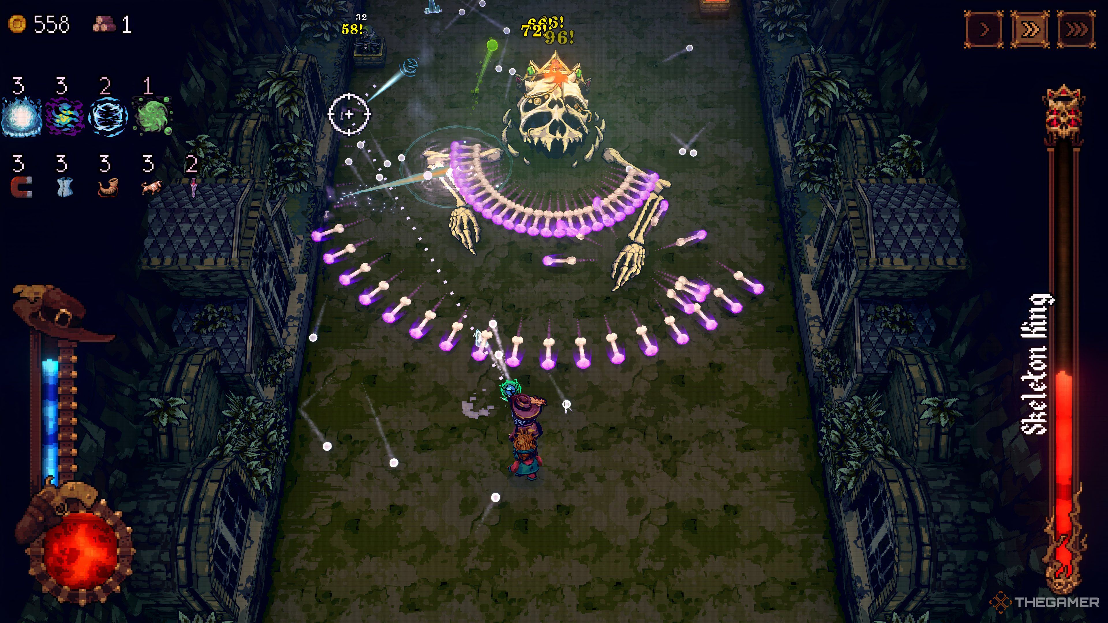Король-скелет по-прежнему может быть сложным боем, даже с мощными, хорошо развитыми персонажами. Вам нужно тщательно целиться, чтобы попасть в его слабое место – корону – одновременно уклоняясь от множества фиолетовых стрел. Хотя сборки, ориентированные на ‘baby balls’, могут облегчить прицеливание, победа над боссом все равно может занять некоторое время.