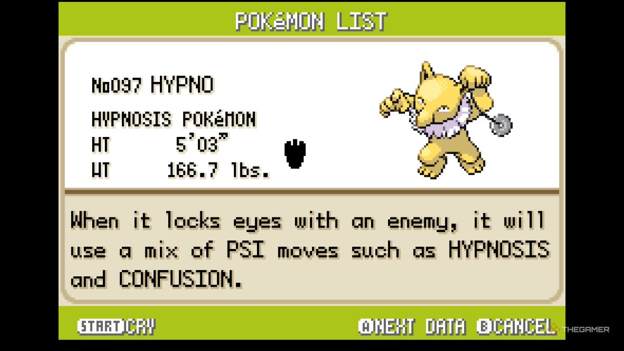 Гипно не кажется впечатляющим на первый взгляд, но как только вы откроете психическую атаку на 35-м уровне, он становится удивительно надёжным психическим типом покемона. Он достаточно силён, чтобы оставаться в вашей команде и помочь вам победить даже Элитную Четвёрку.