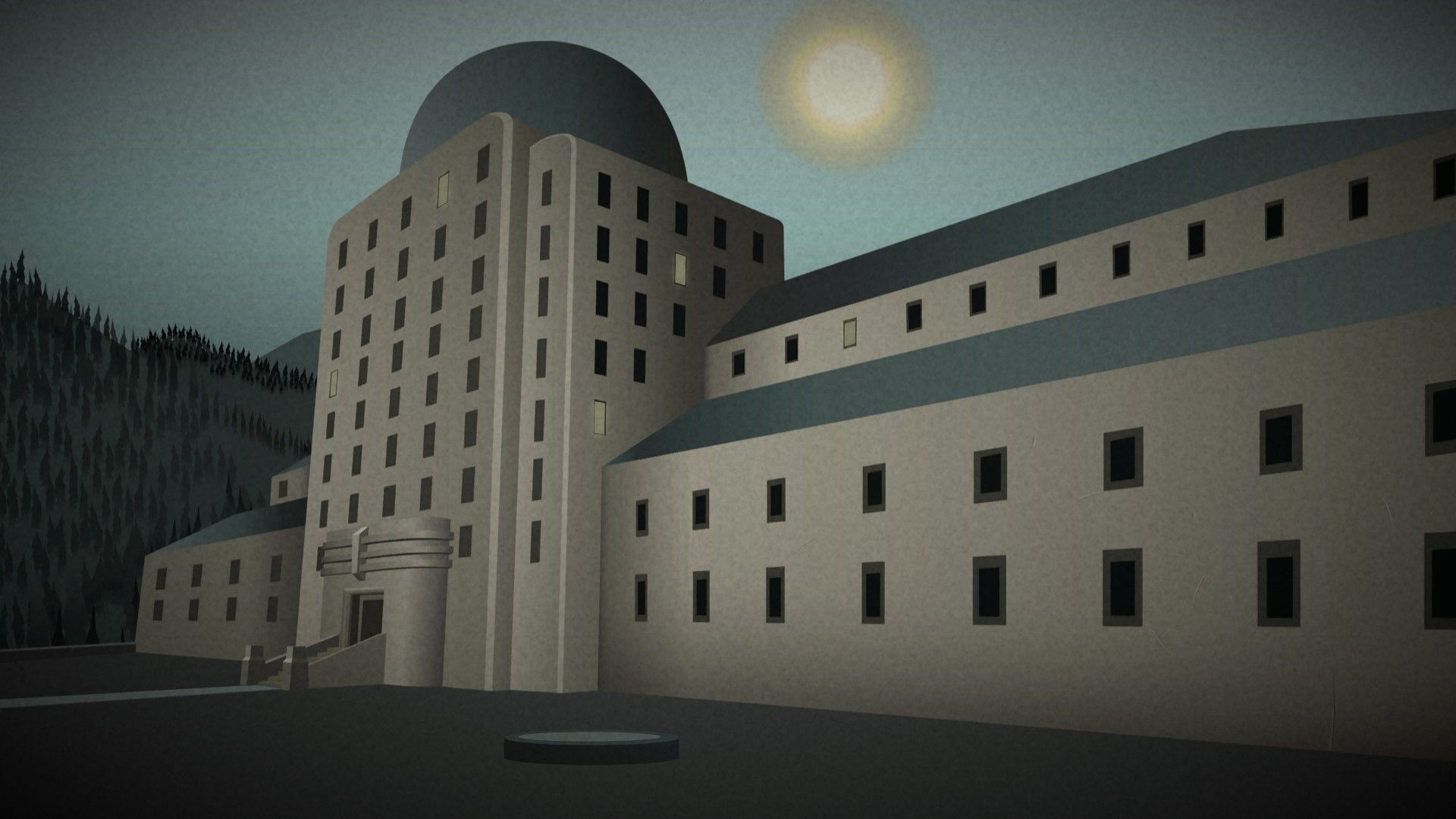 Окей, так что действие игры происходит в 1920-х годах, в этом жутком месте под названием Castle Woods Sanatorium. Художественный стиль просто потрясающий – это всё в стиле ар-деко, с действительно сильными, геометрическими формами и классическими архитектурными решениями. Честно говоря, я не видел много игр, которые смогли бы воплотить такой вид, поэтому он сразу же привлек мое внимание. Это действительно уникальная атмосфера!