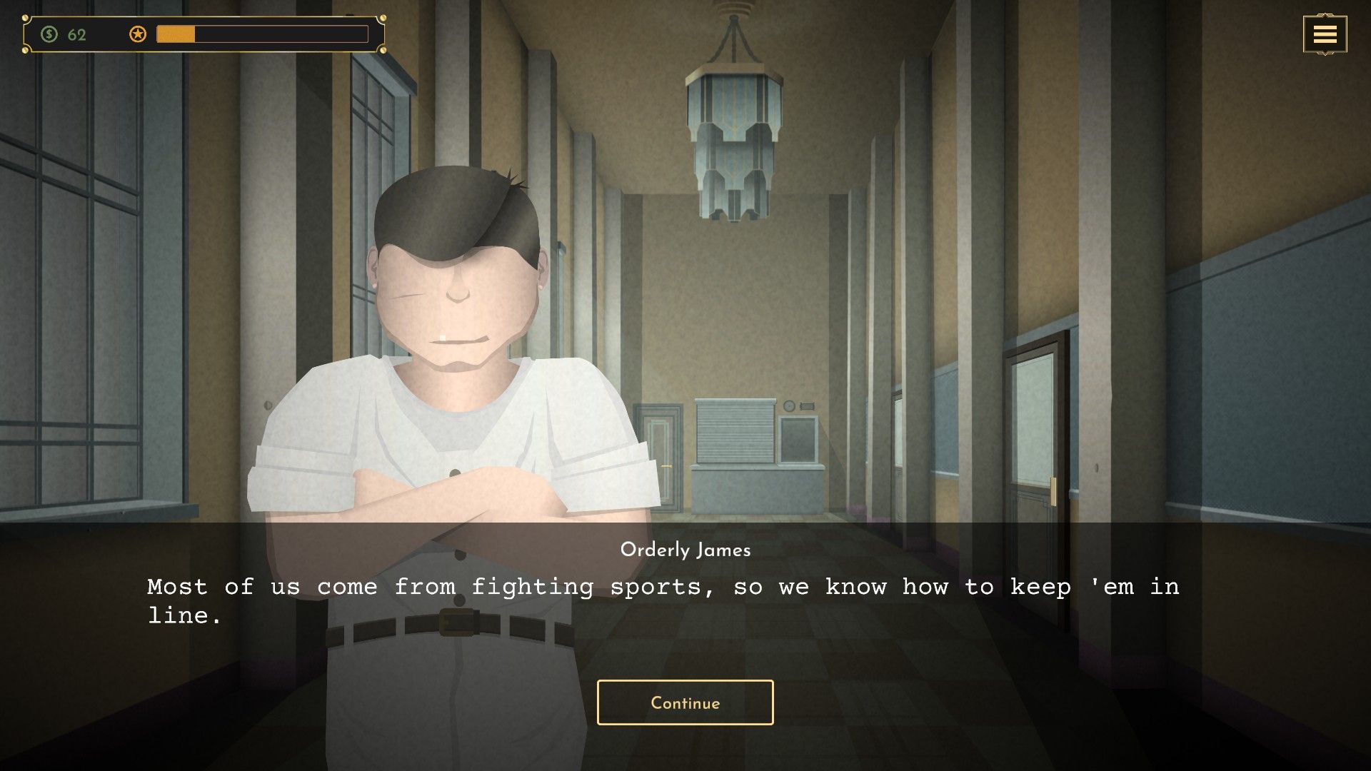 Окей, так что эта игра, Sanatorium, полностью переносит тебя в 1920-е годы – она обладает атмосферой, которая напоминает мне «Великого Гэтсби», но как жуткую видеоигру. Ты играешь за человека, который внедряется в психиатрическую лечебницу, пытаясь выяснить, что случилось с твоей тетей Патти, которую ты не видел целую вечность. Все дело в раскрытии правды, и обстановка потрясающая.