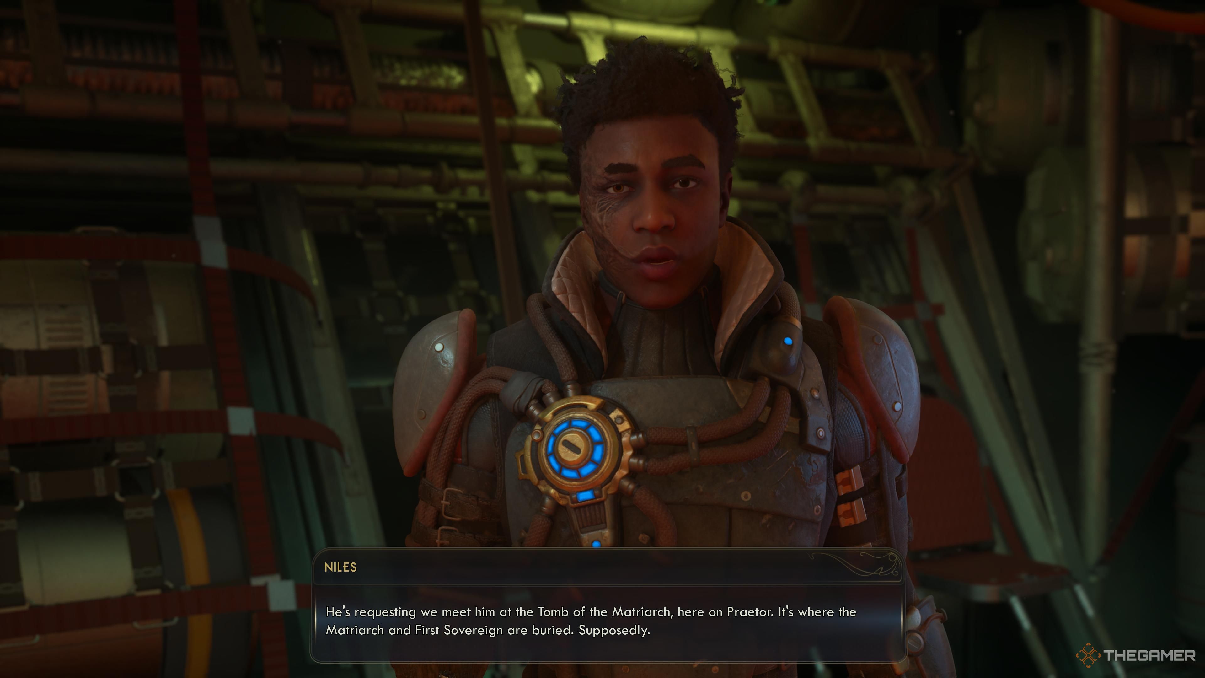 Как только и Претория, и Монастырь станут доступны для путешествий, начнётся квест. Вы найдёте Найлса в трюме корабля, рядом с высокозащищёнными шкафчиками. Он может не появиться, пока вы не зададите курс на Преторию, поэтому проверьте ещё раз после этого. Просто поговорите с ним, чтобы узнать, что Зеб связался и организовал встречу в Гробнице Матриарха на Претории — это вся информация, которой он поделится.