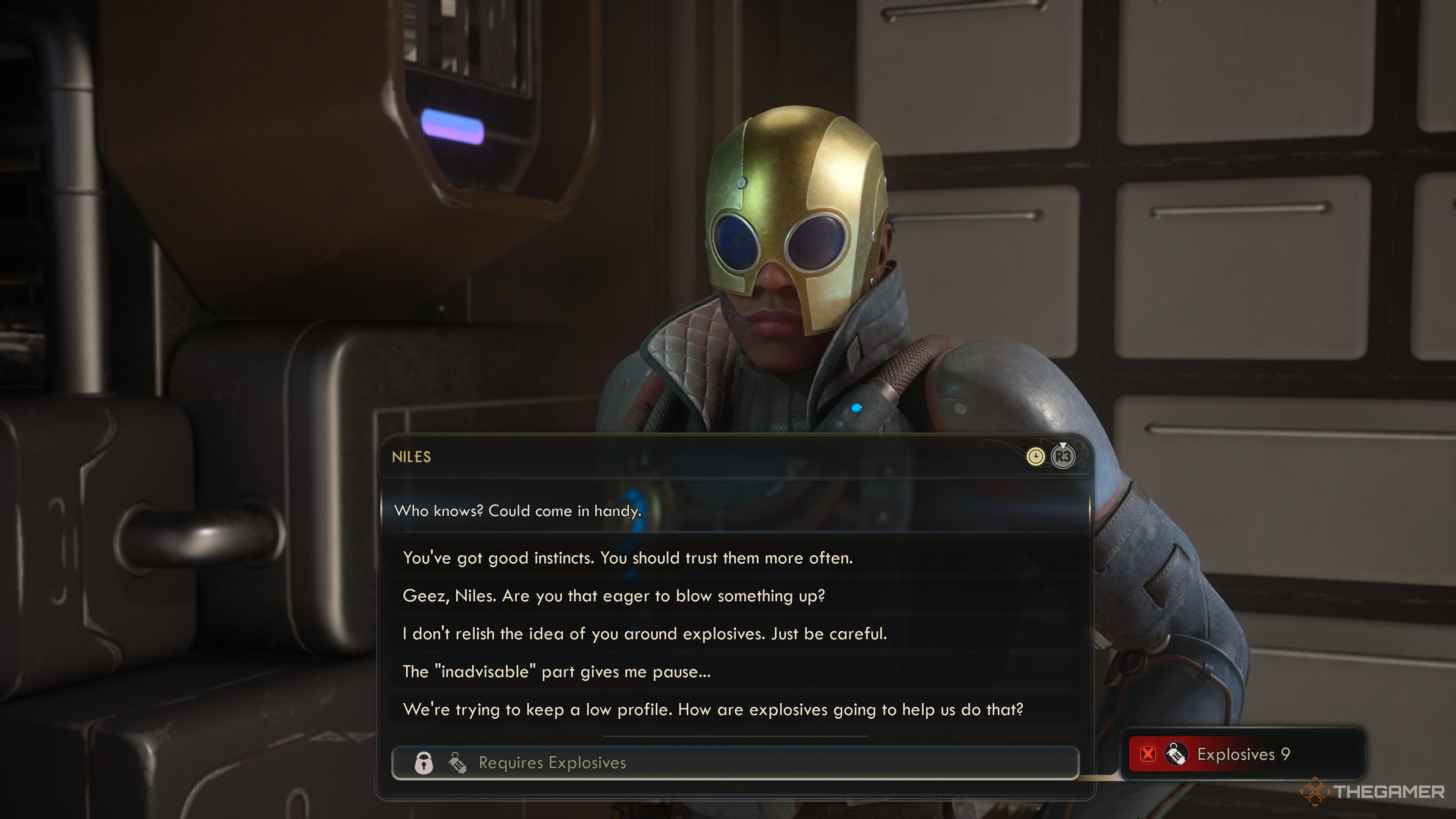 Итак, я вошёл в следующую комнату, и Найлз остановил меня, спросив о Зебе. Он беспокоился, что Зеб ведёт себя иначе – как будто на взводе и более агрессивный, чем обычно. Я мог попытаться его успокоить или просто согласиться, но, честно говоря, казалось, что не имеет значения, как я отвечу. В любом случае, Найлз смастерил взрывчатку и хотел использовать её, чтобы взорвать дверь, поскольку Зеб совершенно не знал, как это сделать.