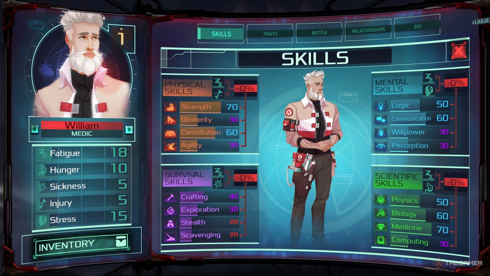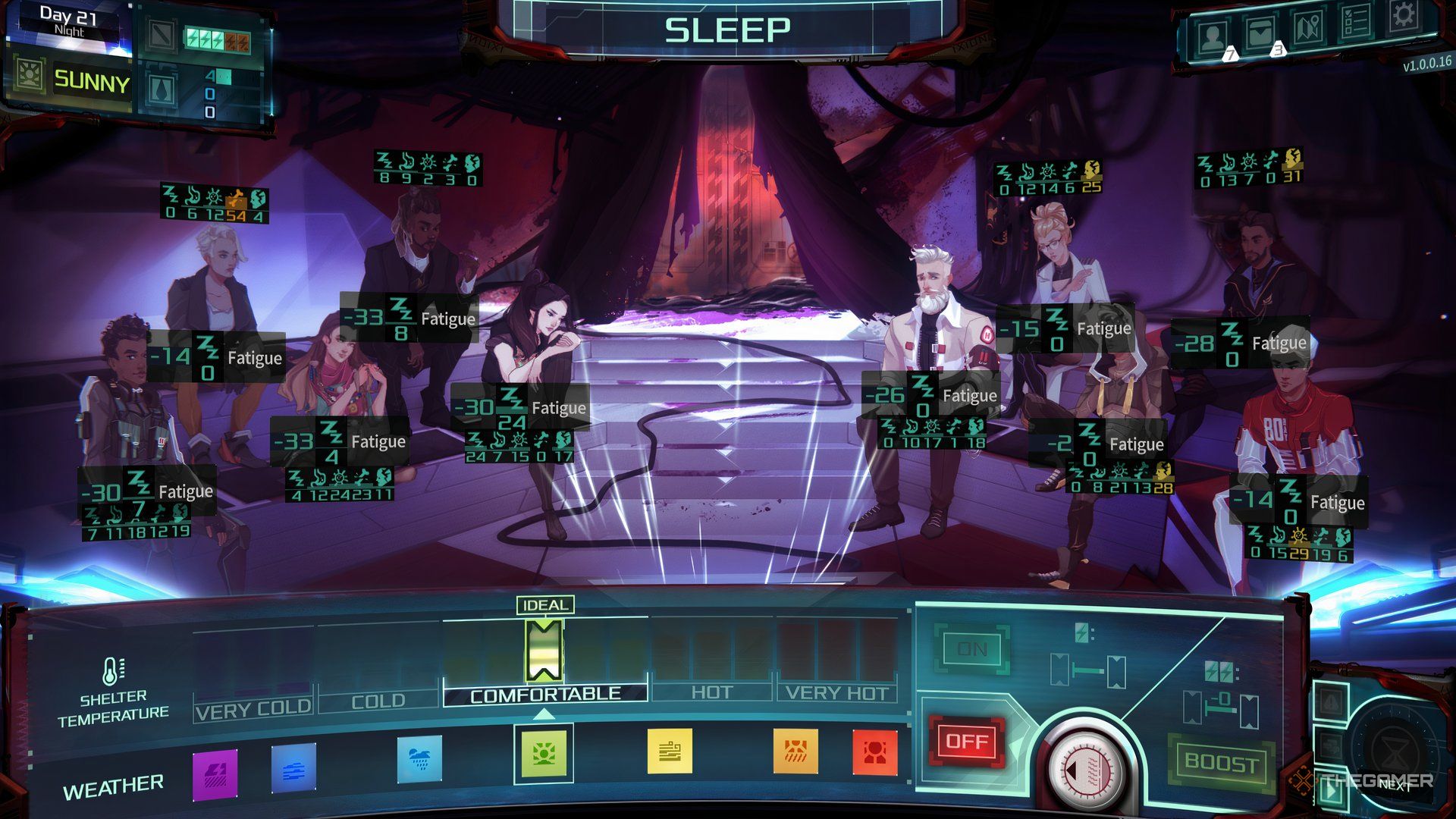 Помимо сбора припасов и поиска новых вещей, ваша самая важная задача – поддерживать здоровье своей команды. У каждого члена команды есть пять ключевых характеристик – Усталость, Голод, Болезнь, Травма и Стресс – которые вам нужно проверять ежедневно. Хотя поначалу это легко контролировать, забота обо всех станет более сложной по мере увеличения вашей команды.