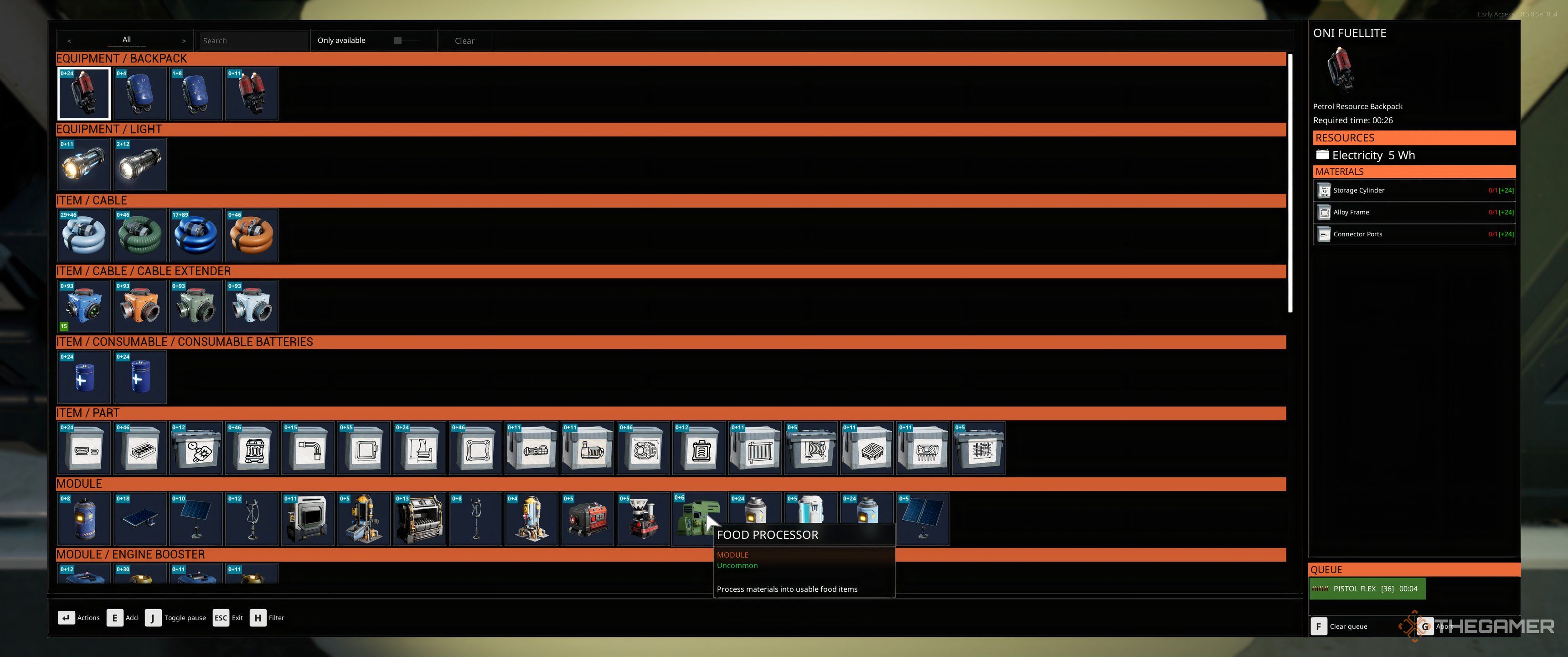 Предметы организованы по категориям, и здесь вы найдете все ваши разблокированные рецепты. Чтобы создать предмет, просто левой кнопкой мыши нажмите на него. Затем щелкните правой кнопкой мыши, чтобы открыть меню с опциями, такими как Build, Build (5), Add Task, Add Missing Parts To Queue и Add All Parts To Queue.