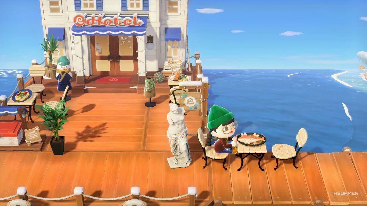 Вы тоже можете создать похожую расслабляющую атмосферу в вашем курортном отеле в Animal Crossing: New Horizons! Расставьте столы и стулья вдоль пирса, выложите на них морепродукты и используйте растения и статуи (даже те, что вам продал Редд!), чтобы придать этой зоне более изысканный вид. Возможно, вы даже заметите, как ваши гости останавливаются перекусить, исследуя ваш остров. Для получения дополнительных баллов поставьте плиту рядом со входом, чтобы создать впечатление, будто еда всегда свежая!