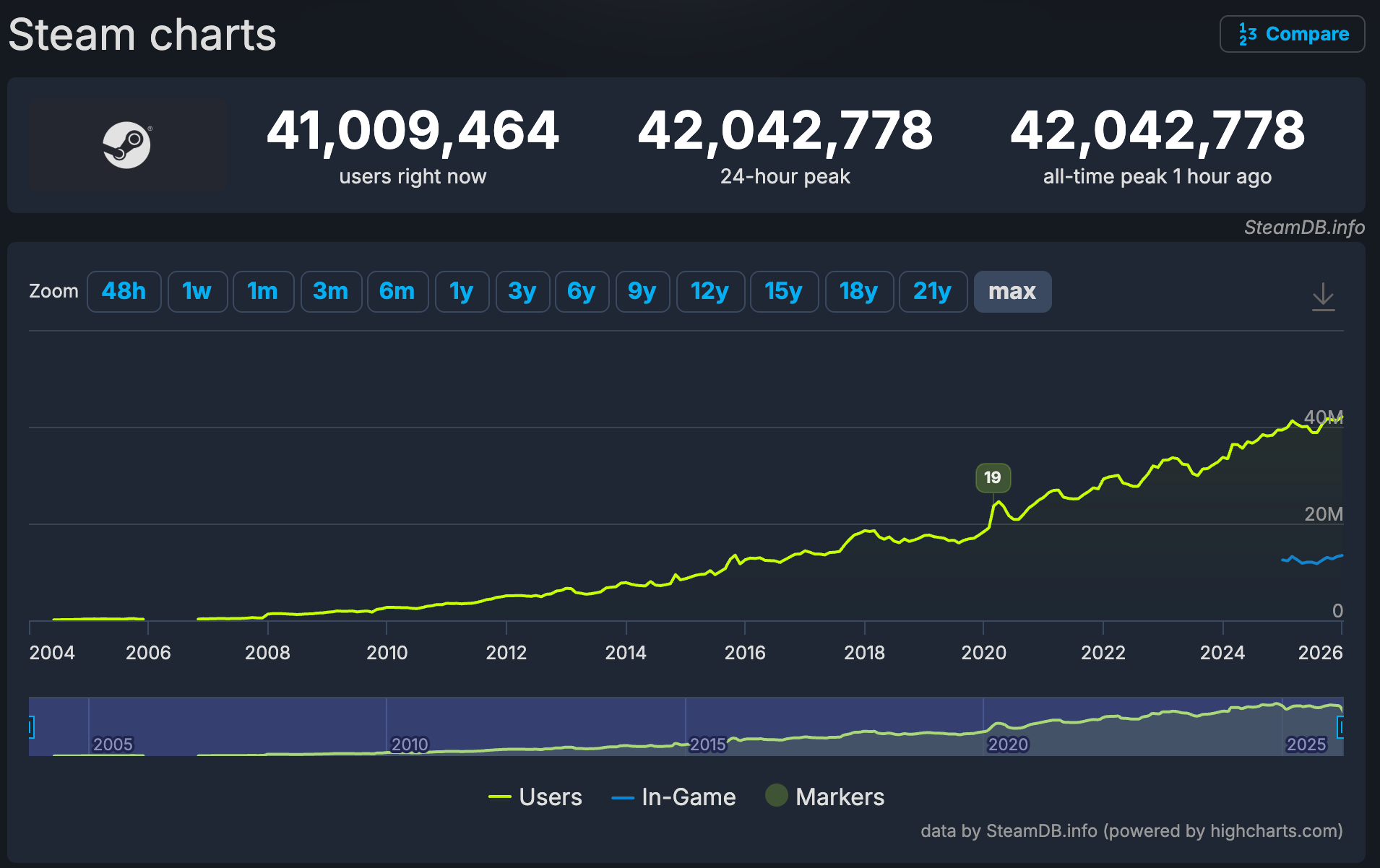 Steam достиг рекордного показателя в более чем 42 миллиона одновременных игроков сегодня, согласно данным SteamDB и пользователю ResetEra. Удивительно, что это произошло в обычный воскресный день в январе, без крупных релизов игр или специальных мероприятий, вызвавших всплеск.
