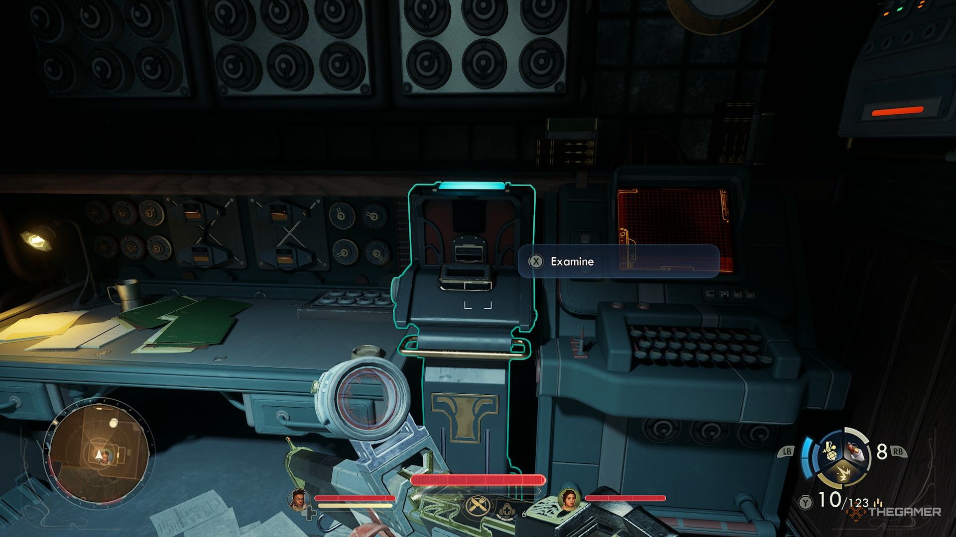 Приложите вашу карту для входа, затем пройдите в заднюю комнату и поищите оборудование. Проверьте синюю машину и выберите опцию ‘постоянно перезаписать трансляции Protectorate’.
