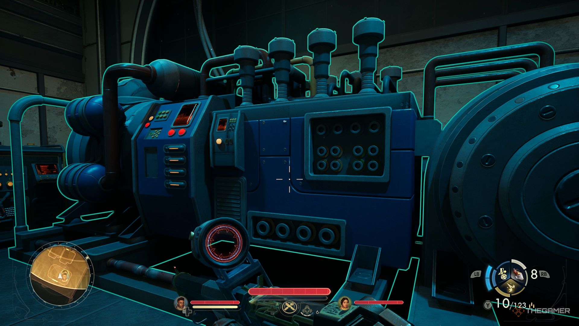 Оказавшись внутри, подойдите к большому генератору и используйте Портативный Гальванический Подрывник, чтобы повредить его.