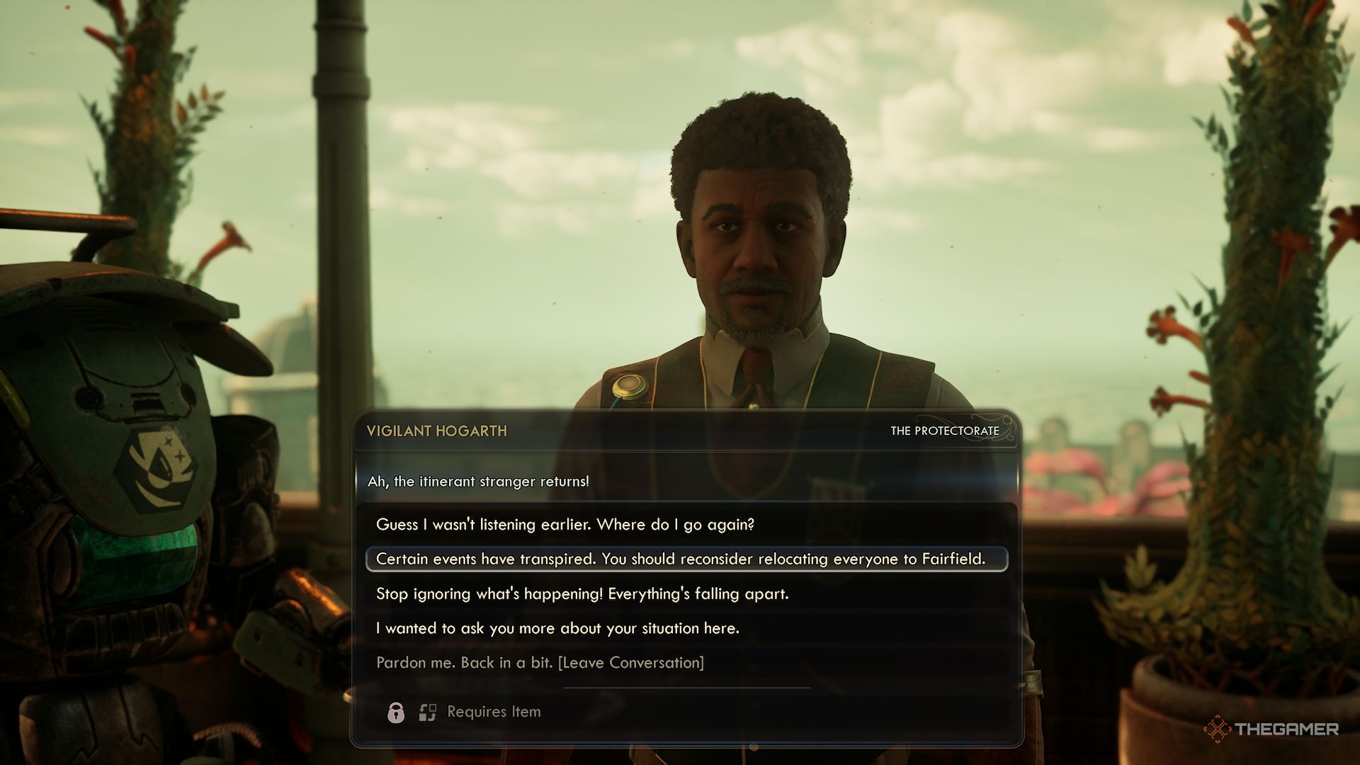 Поговорите с ним немного, затем спросите, что он думает о Хогарте. После этого узнайте, не рассматривал ли он возможность переезда в Фэрфилд, и сообщите ему, что ему заплатят за работу там. Наконец, вы можете либо попытаться убедить его речью, либо спросить: ‘Что, по вашему мнению, привело к тому, что здесь все стало так плохо?’