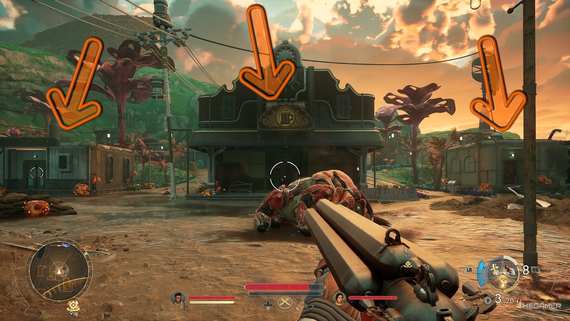 Когда вы достигнете поврежденной зоны и пройдете мимо обрушившихся зданий, вы обнаружите три здания, выстроенные в ряд друг рядом с другом, с баром посередине. В каждом из них находится то, что вы ищете.