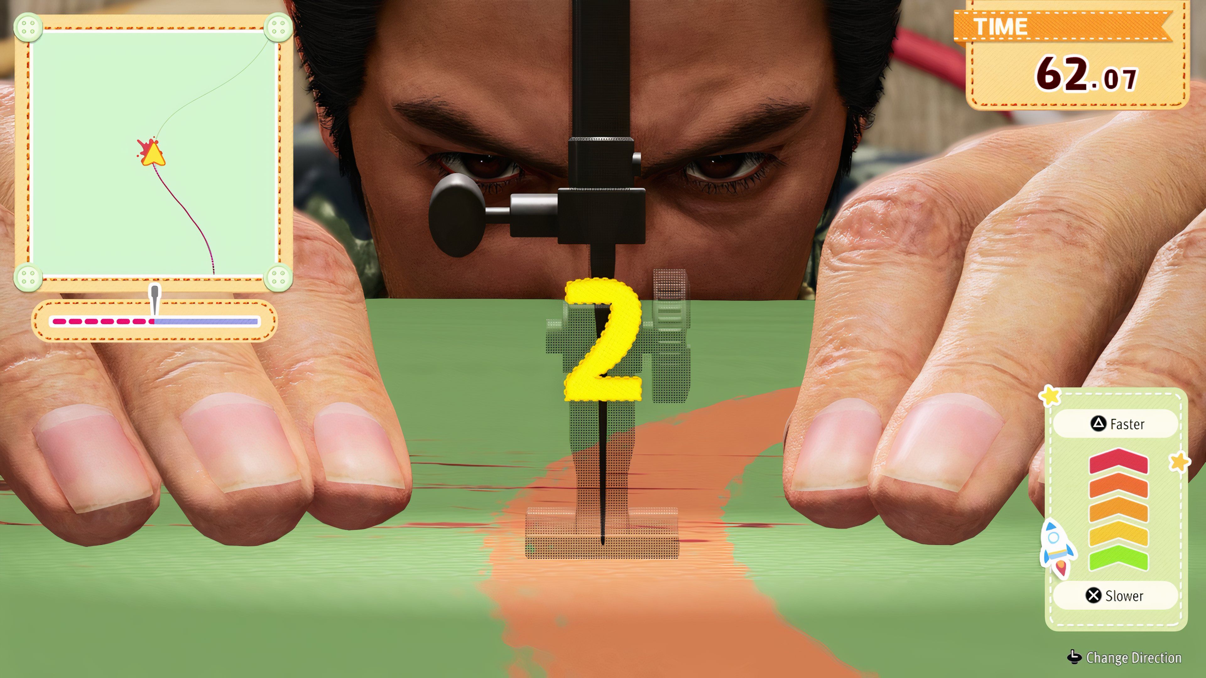 Шитье было следующим, и это оказалось на удивление сложно. Нужно направлять иглу по линии, контролируя скорость, и у меня просто не получалось – как-то вроде того, как я играю в гоночные игры! Мне тяжело даются повороты и там, и там. К счастью, я исправился в кулинарном испытании, где нужно просто нажимать правильные кнопки в правильное время. Мне удалось создать идеальное, легендарное блюдо, так что всем спасибо за это!