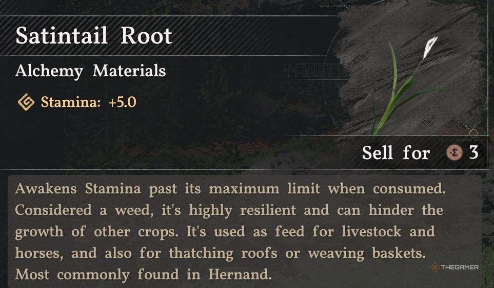 Я обнаружил корень Сатинхвоста, растущий возле ручья в Сумрачных лесах, которые находятся к западу от города Хернанд.