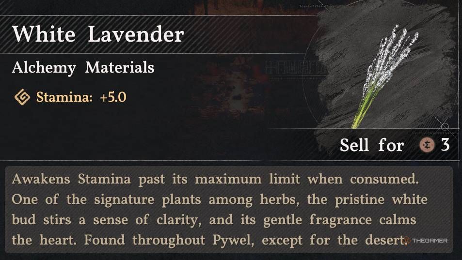 Белая лаванда встречается по всему Пивелу, но не растёт в пустыне. Ищите её вокруг Холма Наковальни в Хернанде.