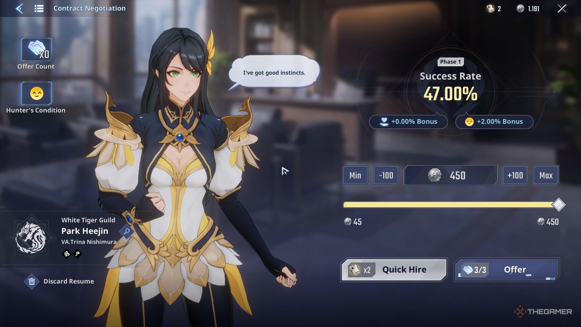 Окей, я проверил трёх потенциальных новобранцев и решил, кого хочу попробовать взять в свою команду. Просто предупреждаю – убедитесь, что у вас достаточно монет Охотника сохранено! Вам нужно будет реально заплатить им, чтобы они присоединились, поэтому сначала вам придется договориться об их зарплате.