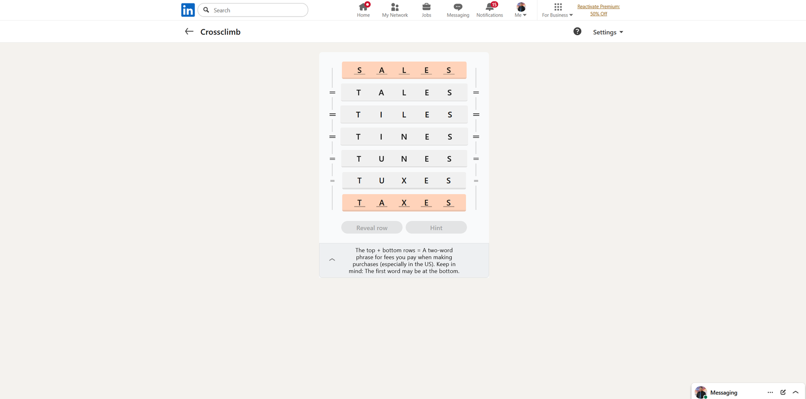 Вот решение сегодняшнего LinkedIn Crossclimb: