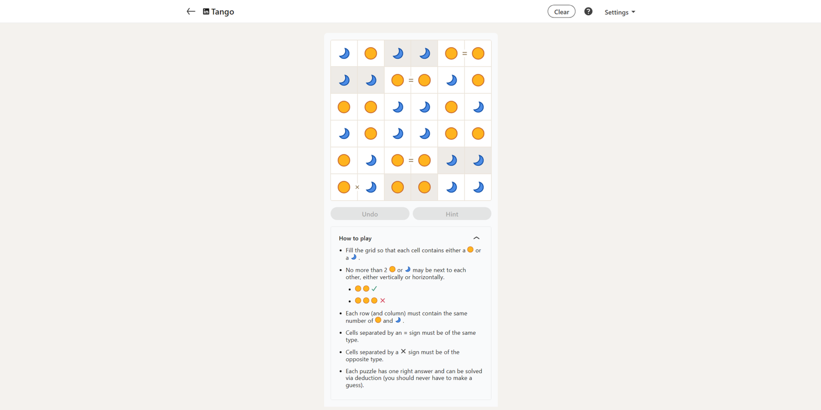 Сегодняшняя головоломка Tango довольно проста, как и другие. С восемью уже заполненными числами, и все они пары, сетку довольно легко завершить благодаря многочисленным знакам равенства, которые предоставлены.