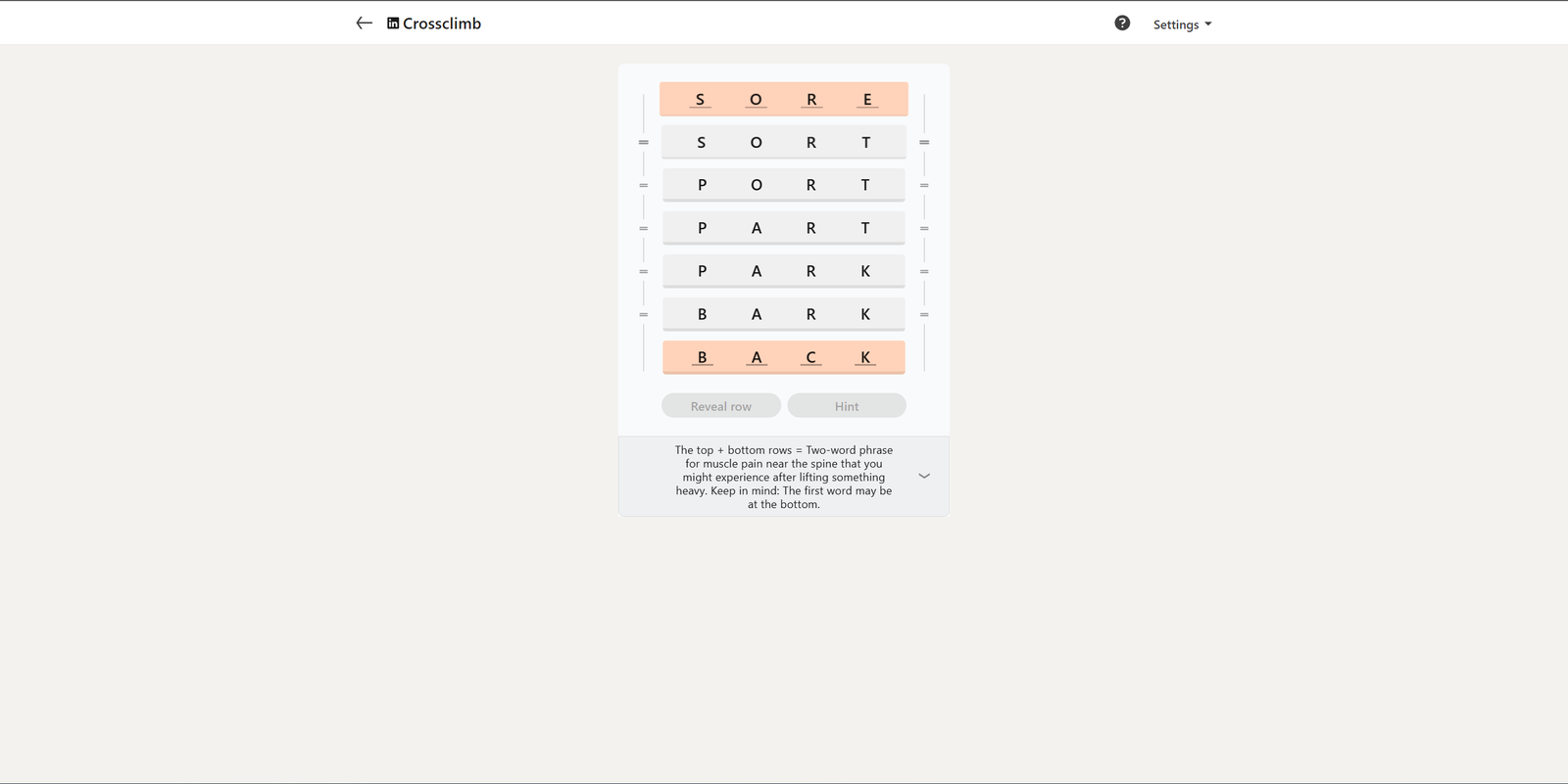 Вот решение для сегодняшнего LinkedIn Crossclimb: