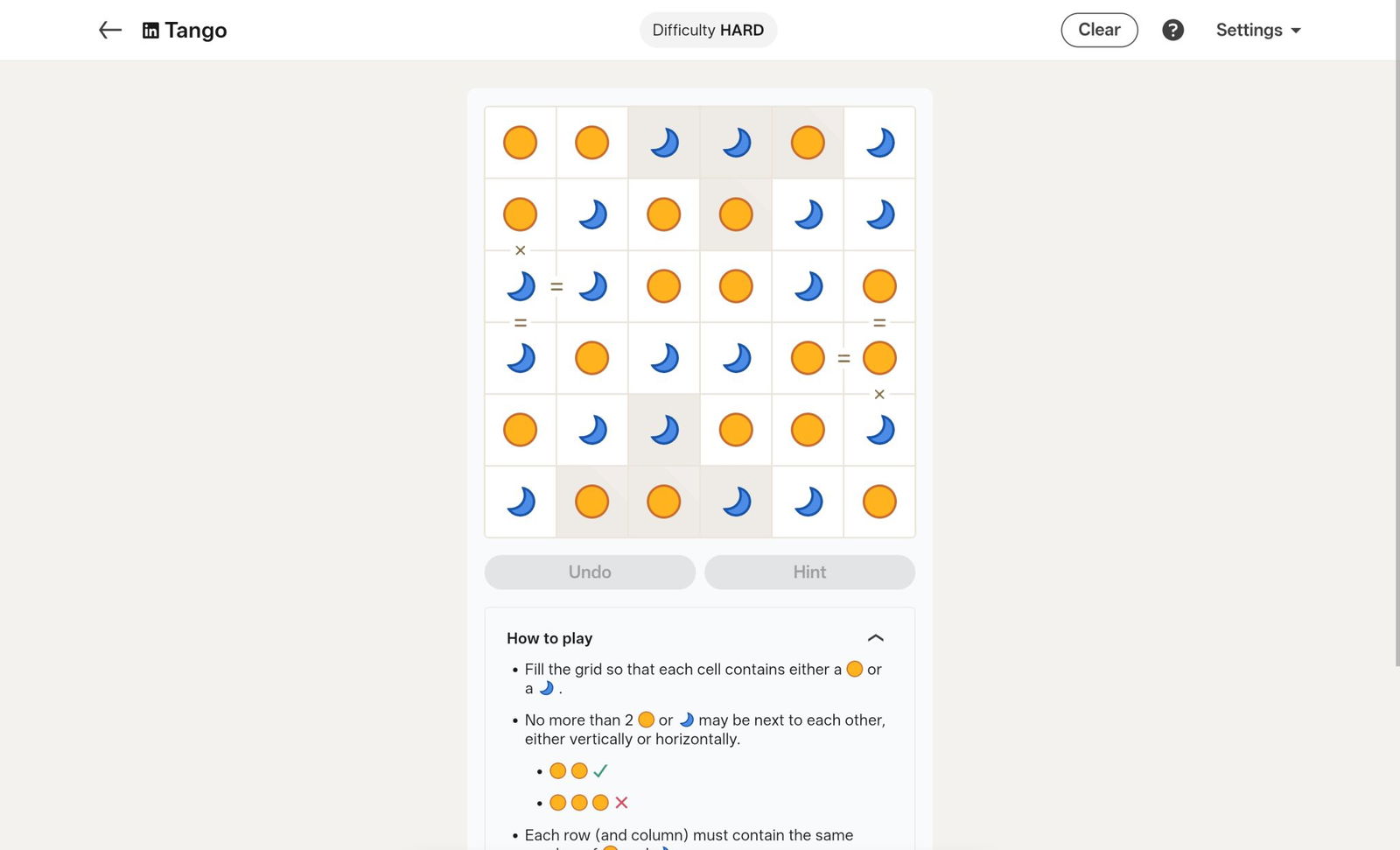 Сегодняшняя головоломка Tango проста и начинается со стандартных восьми заполненных квадратов. Она немного сложнее вчерашней, но остается относительно легкой.
