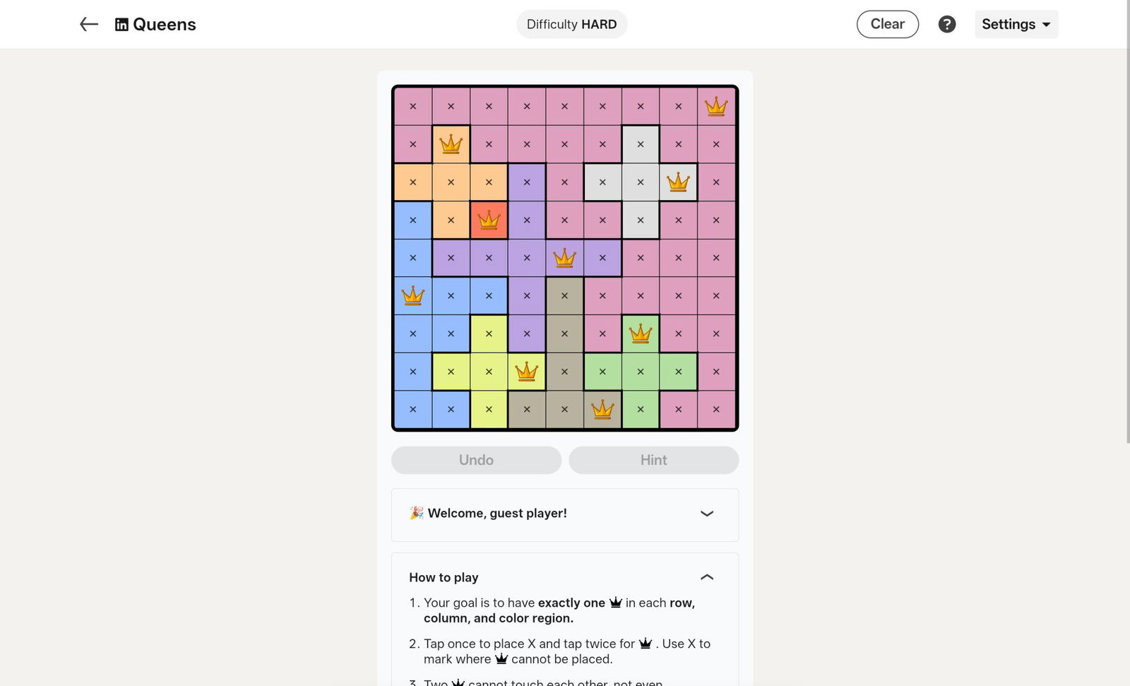 Сегодняшняя головоломка Queens вернулась к сетке 9×9, и она намного проще вчерашней. Цвета расположены в простых узорах, что облегчает поиск решений.