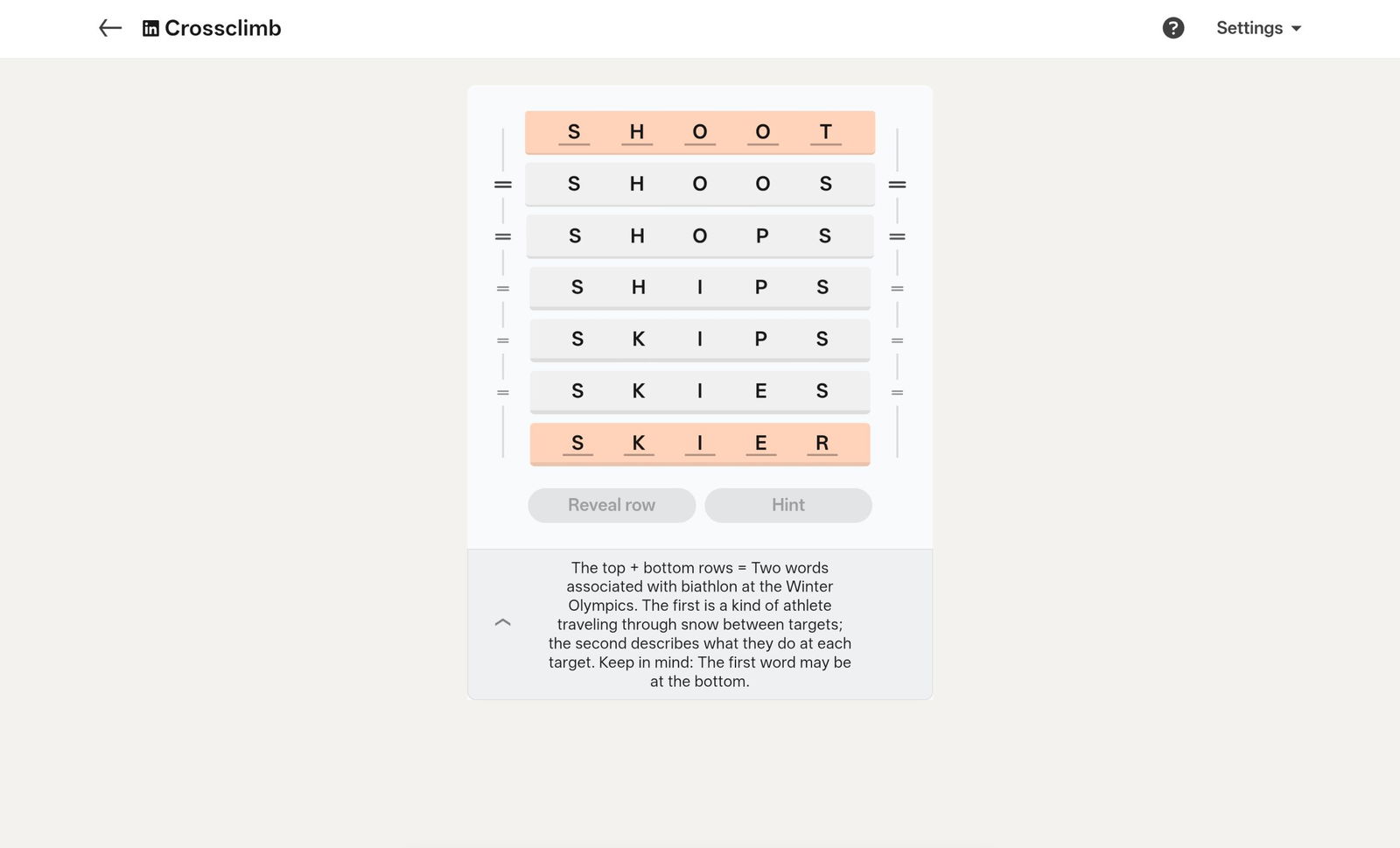 Вот решение для сегодняшнего LinkedIn Crossclimb:
