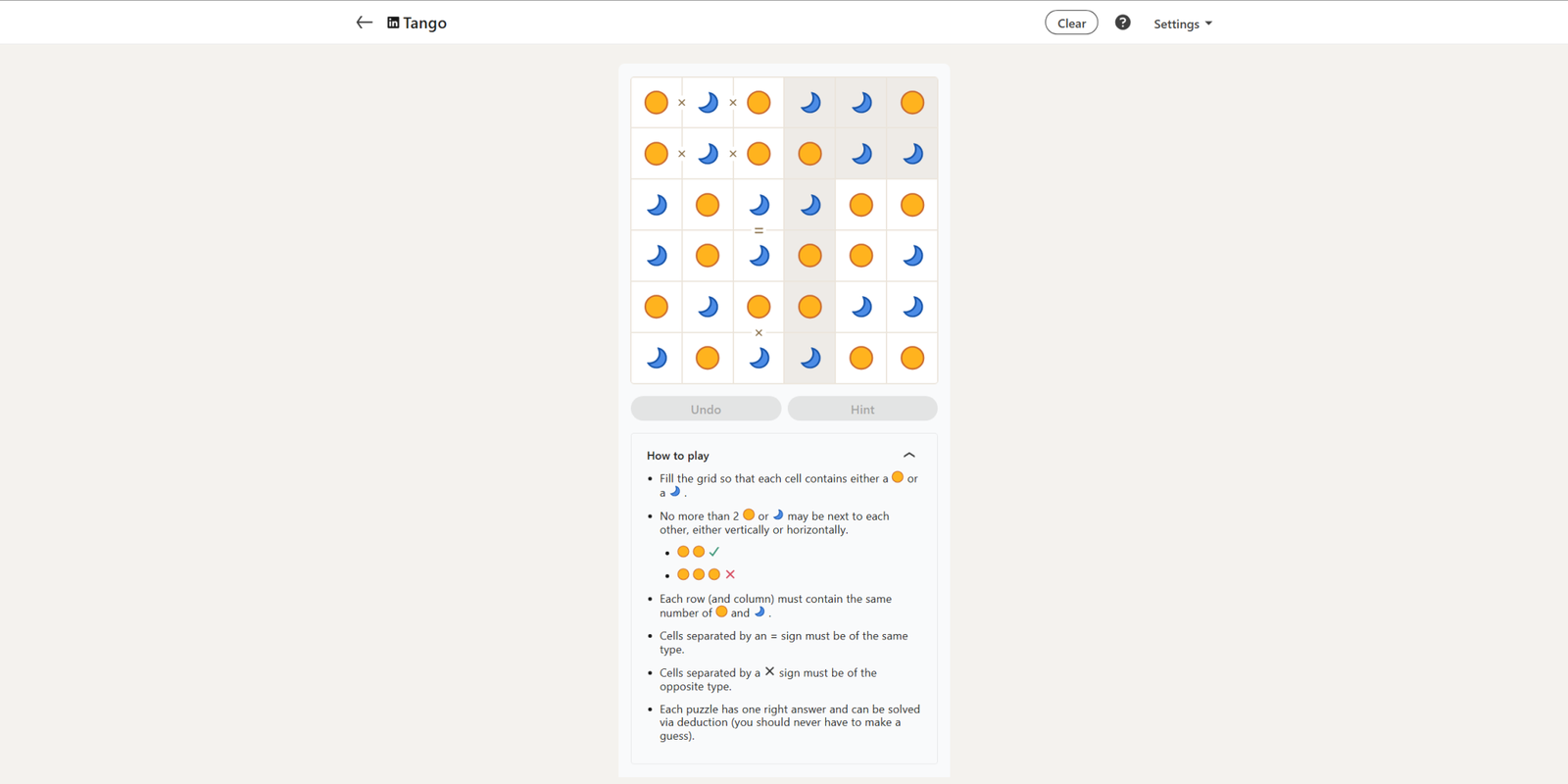 Сегодняшняя головоломка Tango начинается с десяти уже заполненных квадратов, что делает оставшуюся сетку довольно простой в завершении, поскольку всё взаимосвязано. Вы также заметите много ‘X’ и знаков равенства (=) внутри головоломки.