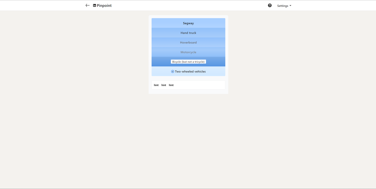 Сегодняшняя головоломка Pinpoint сложна, если вы не знакомы с темой. Первая подсказка, ‘Segway’, может позволить некоторым людям угадать ответ случайно. Вторая подсказка, ‘Hand truck’, особо не помогает сузить круг вариантов, однако.