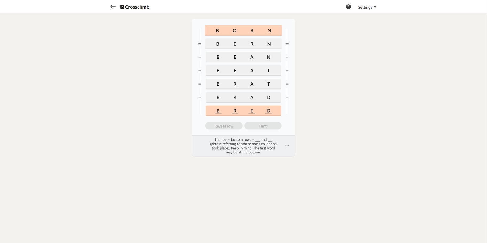 Вот решение для сегодняшнего LinkedIn Crossclimb: