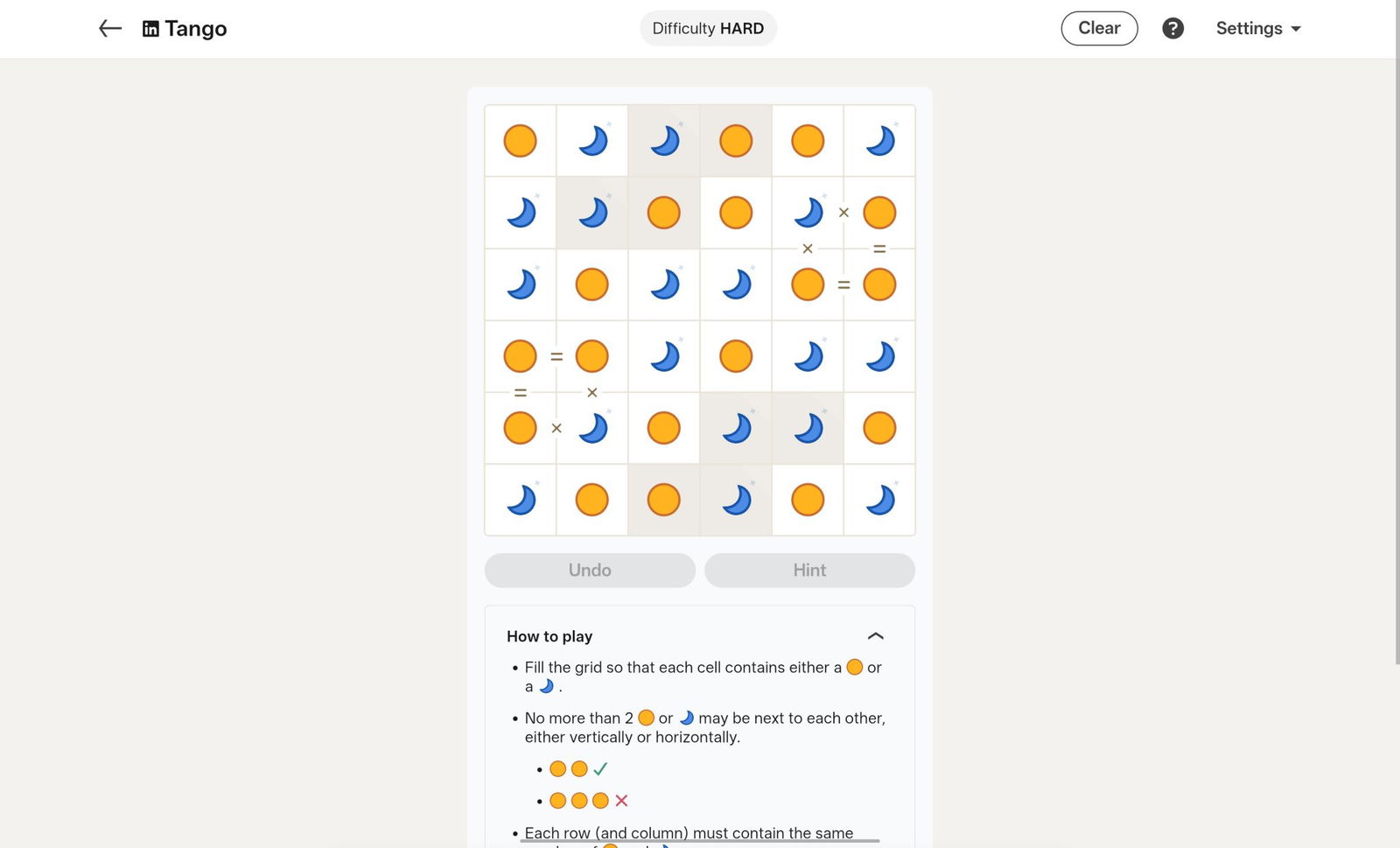 Сегодняшняя головоломка Танго началась с того, что уже было заполнено восемь квадратов. На первый взгляд она казалась более сложной, но на самом деле я не обнаружил, что её значительно труднее решить, чем вчерашнюю.