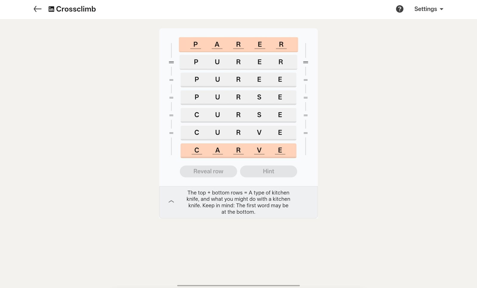 Вот решение для сегодняшнего LinkedIn Crossclimb: