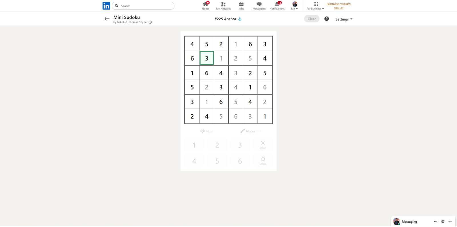 Решение LinkedIn Mini Sudoku за 24 марта 2026 года (#225)