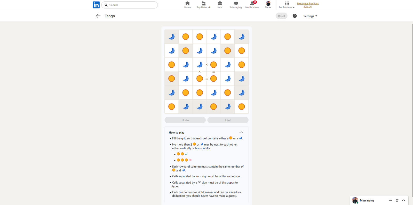 Сегодняшняя головоломка Танго начинается с двенадцати уже заполненных квадратов, и кажется довольно простой, как обычно. Тем не менее, решать её всё ещё приятно!