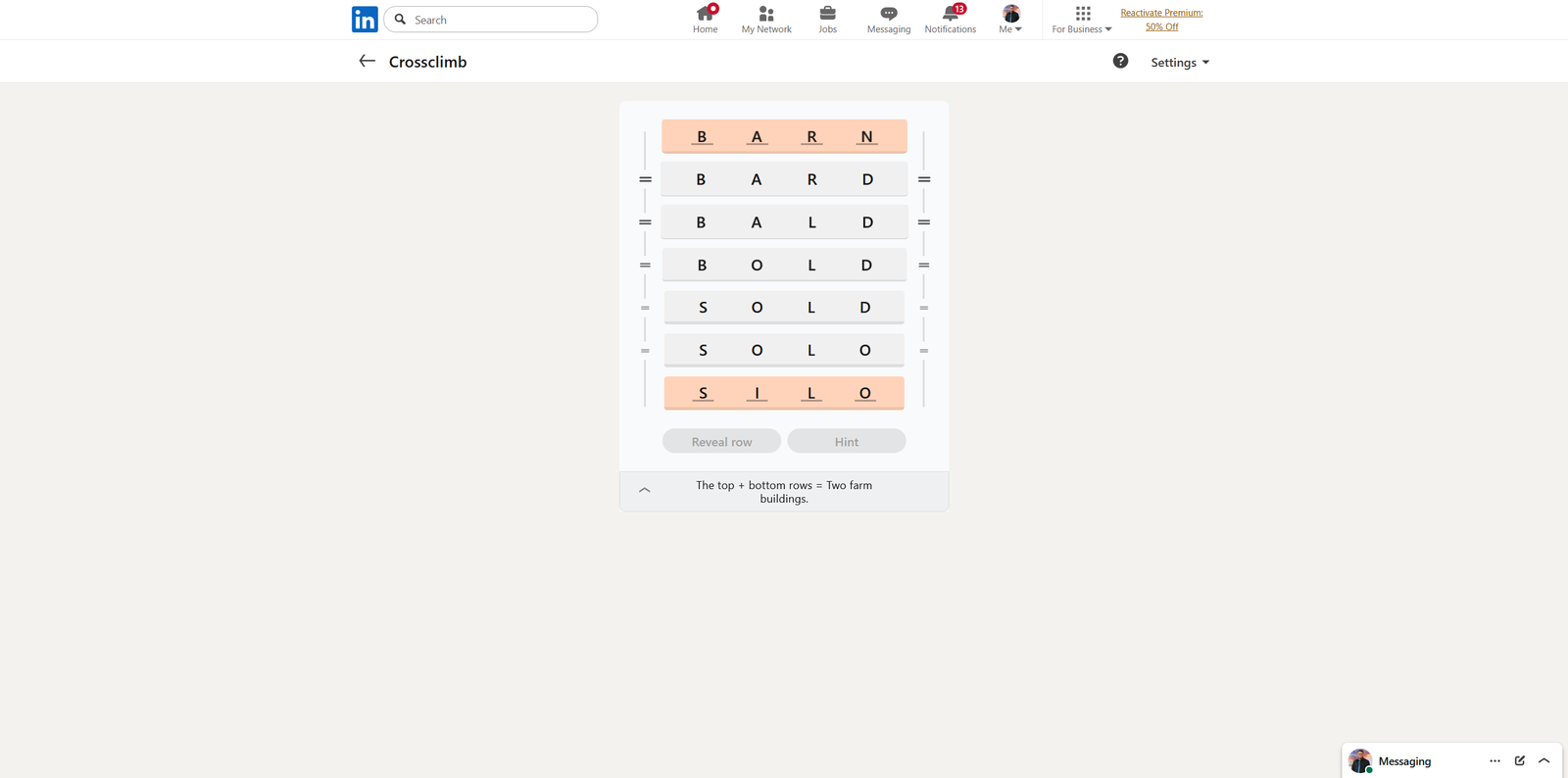 Вот решение для сегодняшнего LinkedIn Crossclimb: