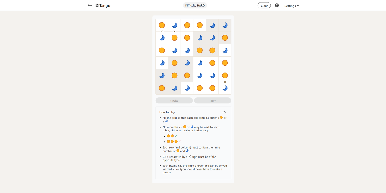 Сегодняшняя головоломка Tango довольно проста. Она начинается с щедрых четырнадцати уже заполненных квадратов – одного из самых высоких чисел, которые мы встречали – что делает оставшуюся часть сетки очень простой в заполнении.