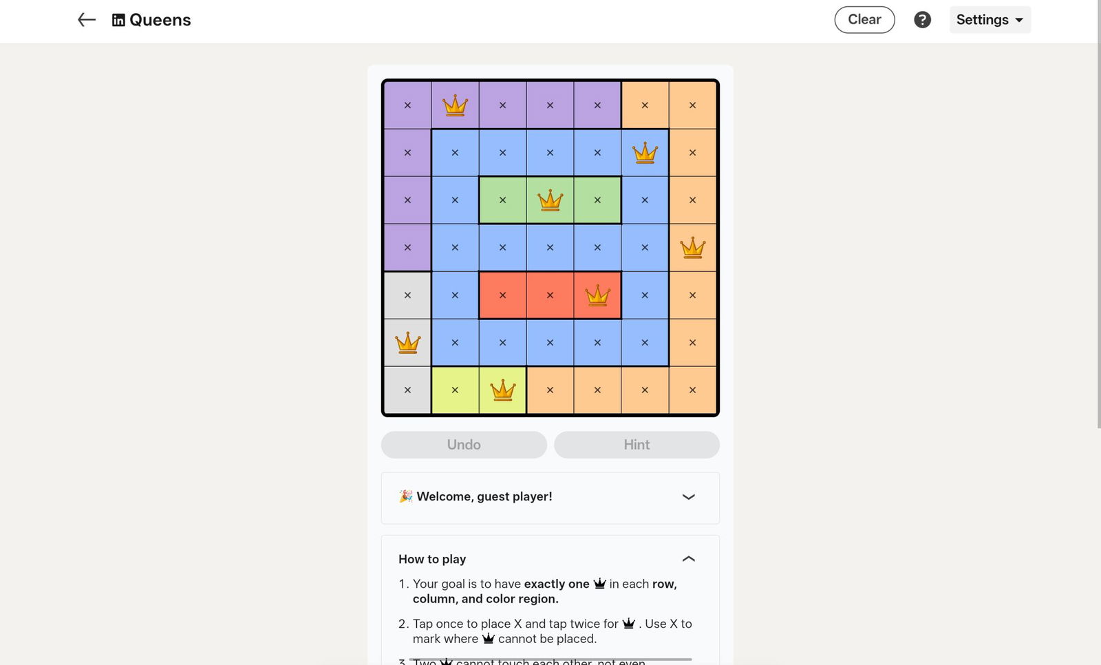 Окей, сегодняшняя головоломка Queen была очень легкой! Это все еще поле 7×7, и, честно говоря, цвета практически говорят вам, куда все нужно поставить. Очень просто, не очень сложно, но быстрая победа, что всегда приятно!