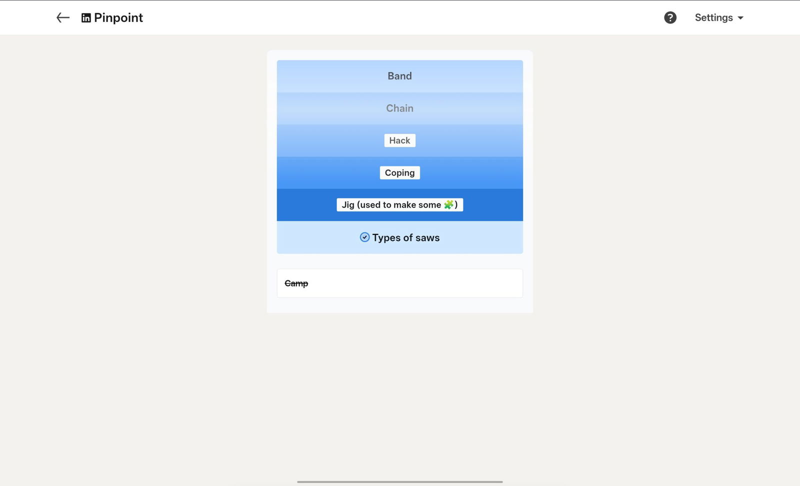 Третья подсказка – ‘Hack’, которая должна сделать ответ гораздо более очевидным. Четвёртая подсказка – ‘Coping’, но она может на самом деле запутать, если вы ещё не поняли. Наконец, последняя подсказка – ‘Jig’ – инструмент, используемый при изготовлении головоломок – и ответ таков: Типы пил.