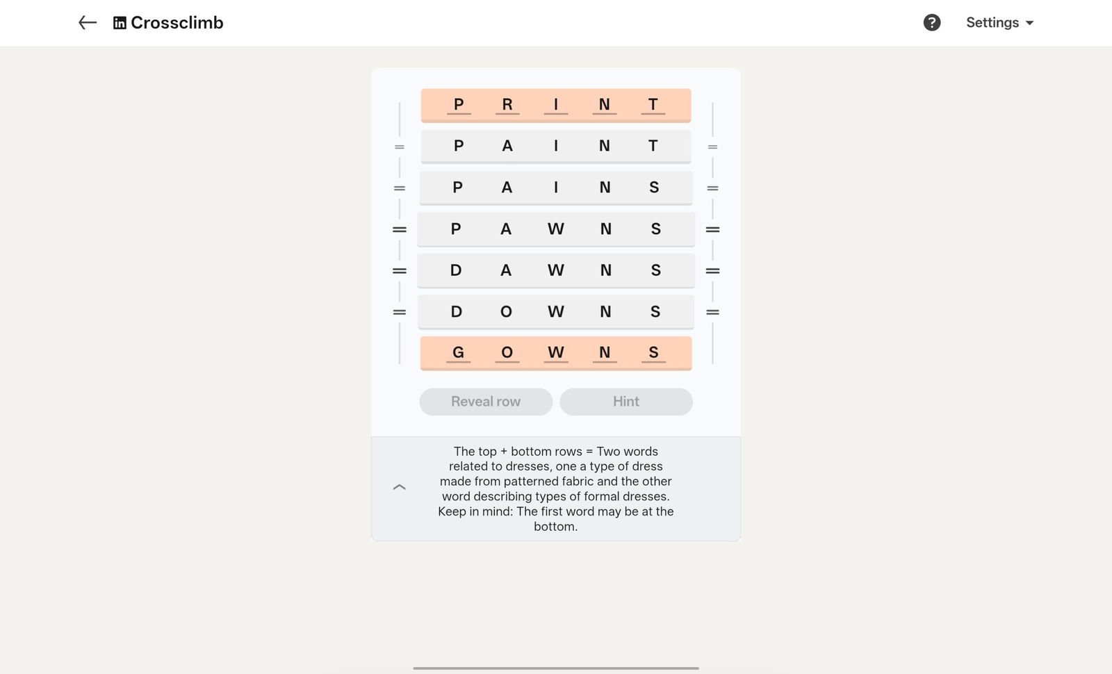 Вот решение сегодняшнего LinkedIn Crossclimb: