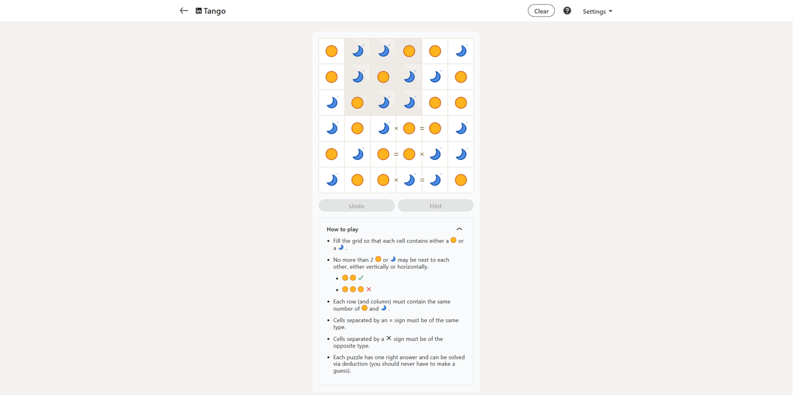 Сегодняшняя головоломка Tango довольно проста. С девятью уже заполненными клетками и множеством связанных между собой, остальная часть сетки легко завершается. Кроме того, имеется множество Xs и знаков равенства, чтобы помочь вам.