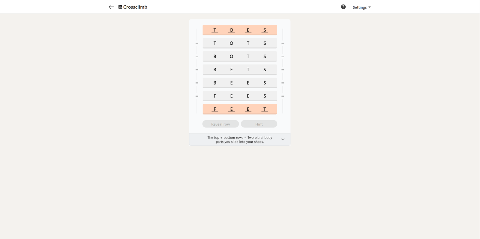Вот решение для сегодняшнего LinkedIn Crossclimb: